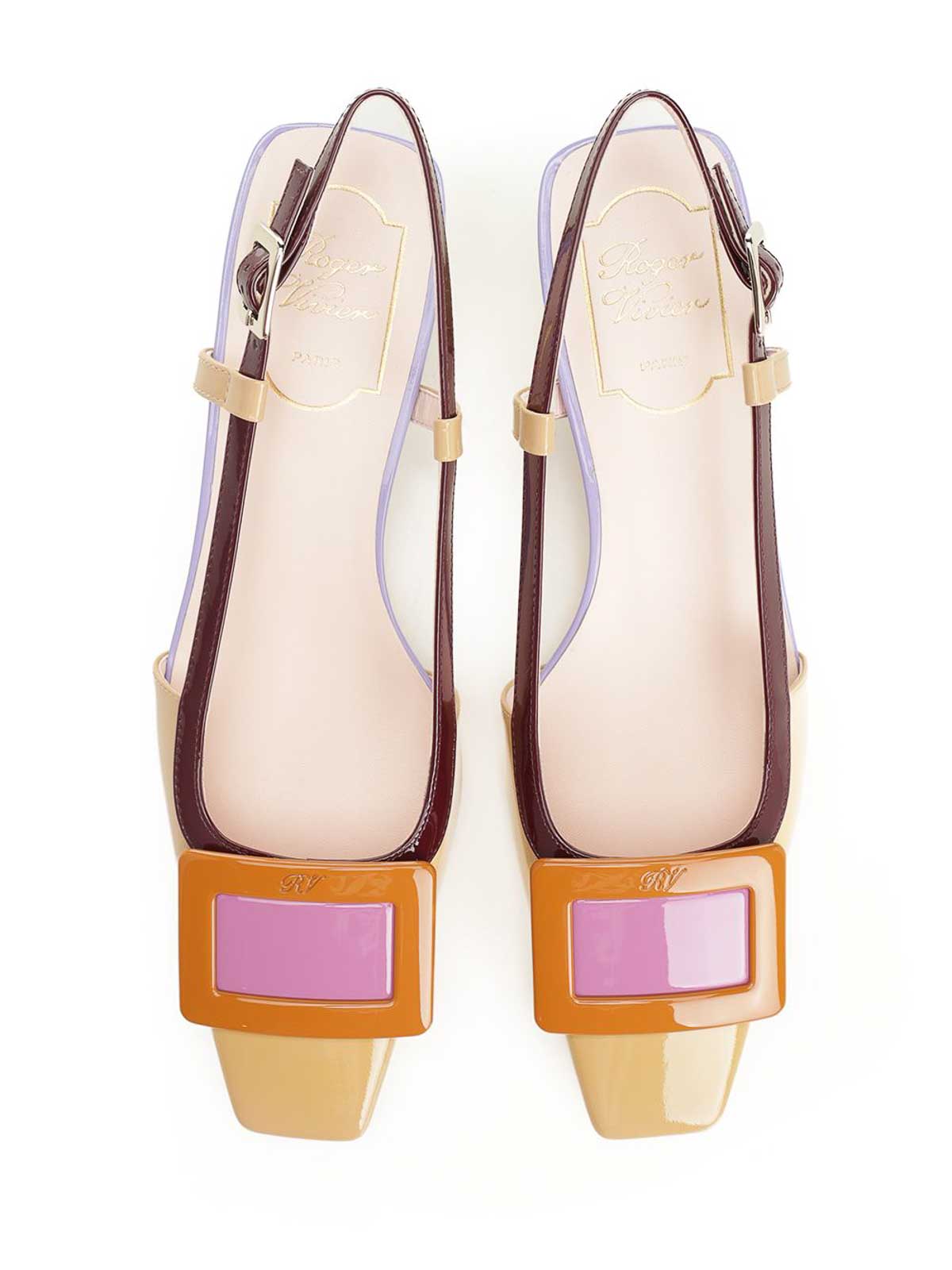 ロジェヴィヴィエのパテントカーフスキン製ベルヴィヴィエスリングバックパンプス。スクエアトゥとパテントレザーで覆われたバックル、ヒールストラップ、レザーインソール、レザーソール、覆われたスカイスクレイパーヒールが特徴です。