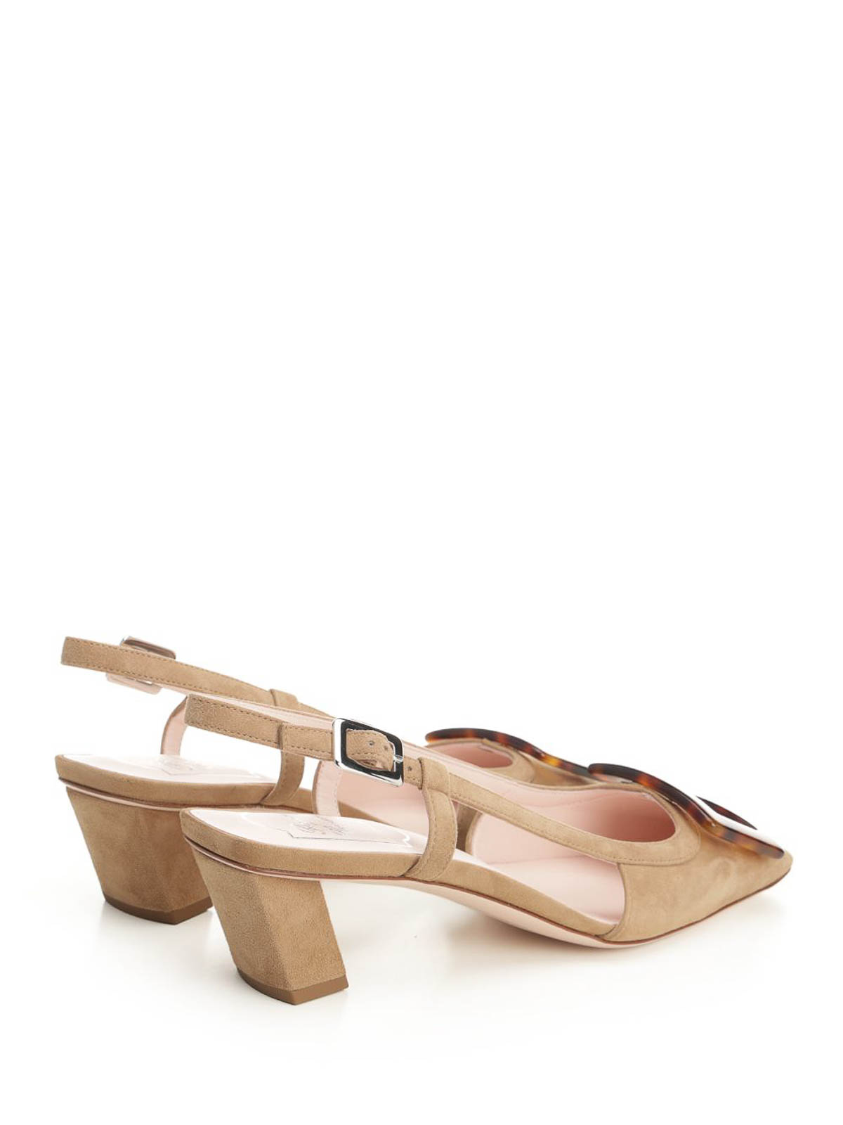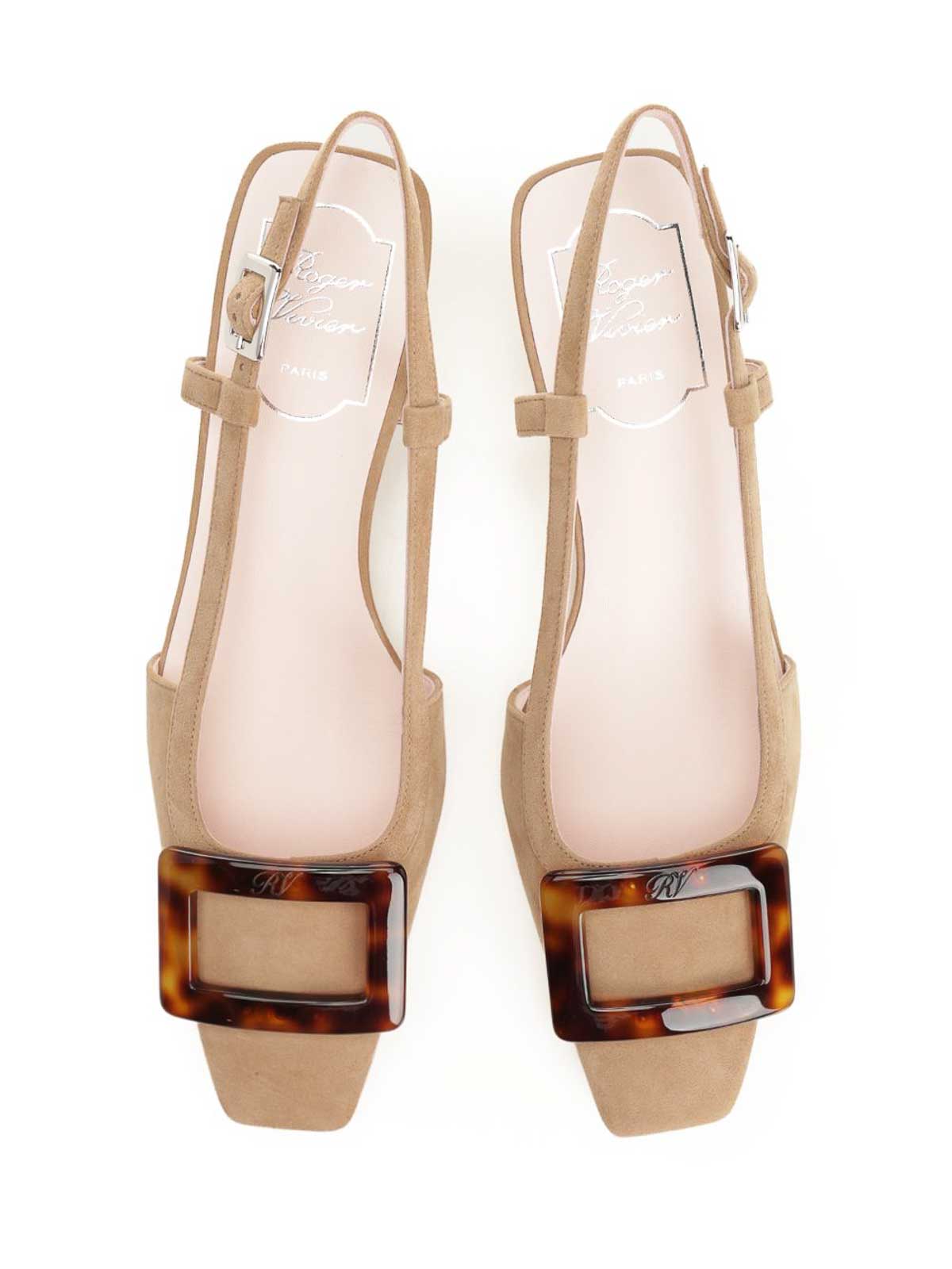 ロジェ・ヴィヴィエのベル・ヴィヴィエ・スエードのスリングバックは、スクエアトゥ、べっ甲のロゴ入りバックル、覆われたスカイスクレイパーヒール、レザーソールが特徴です。