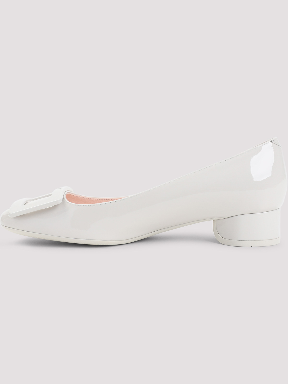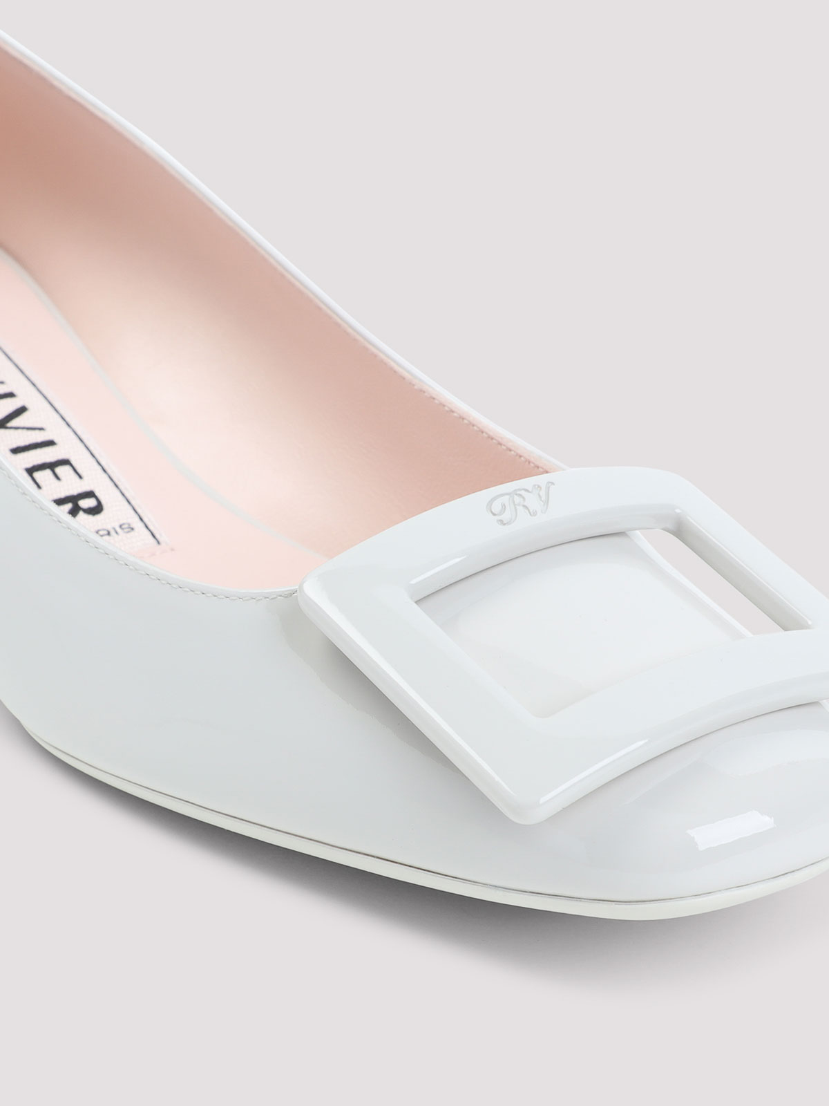 ロジェヴィヴィエミディアムアイスホワイトレザーラウンドラッカー仕上げ25デコルテ。ピュアメディアムアイスホワイトレザーパンプス、スクエアトゥ、ロゴ刻印入りトップスクエアディテール、スリッポンスタイル、ワイドヒール、トーナルソール。