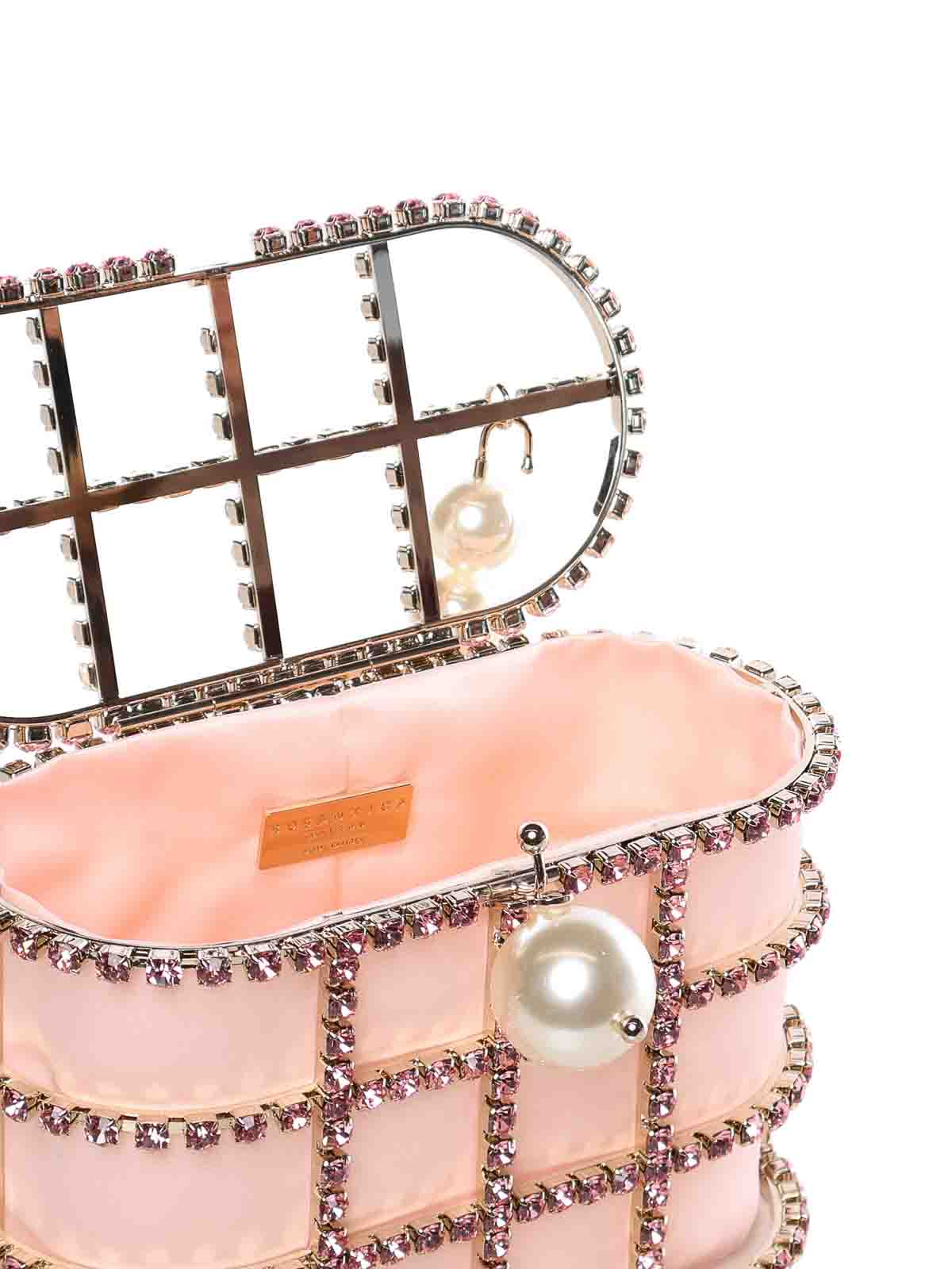真鍮のフレームにクリスタルとフェイクパールを使用、裏地はサテン、イタリア製、寸法:18 x 12 x 9 cm、色:ピンク