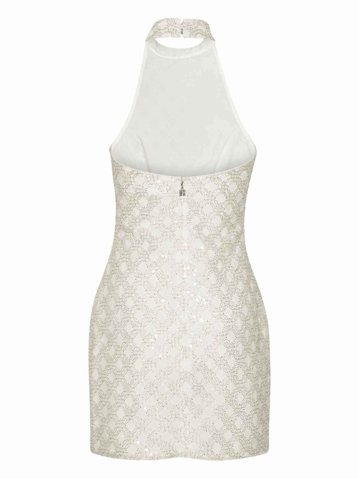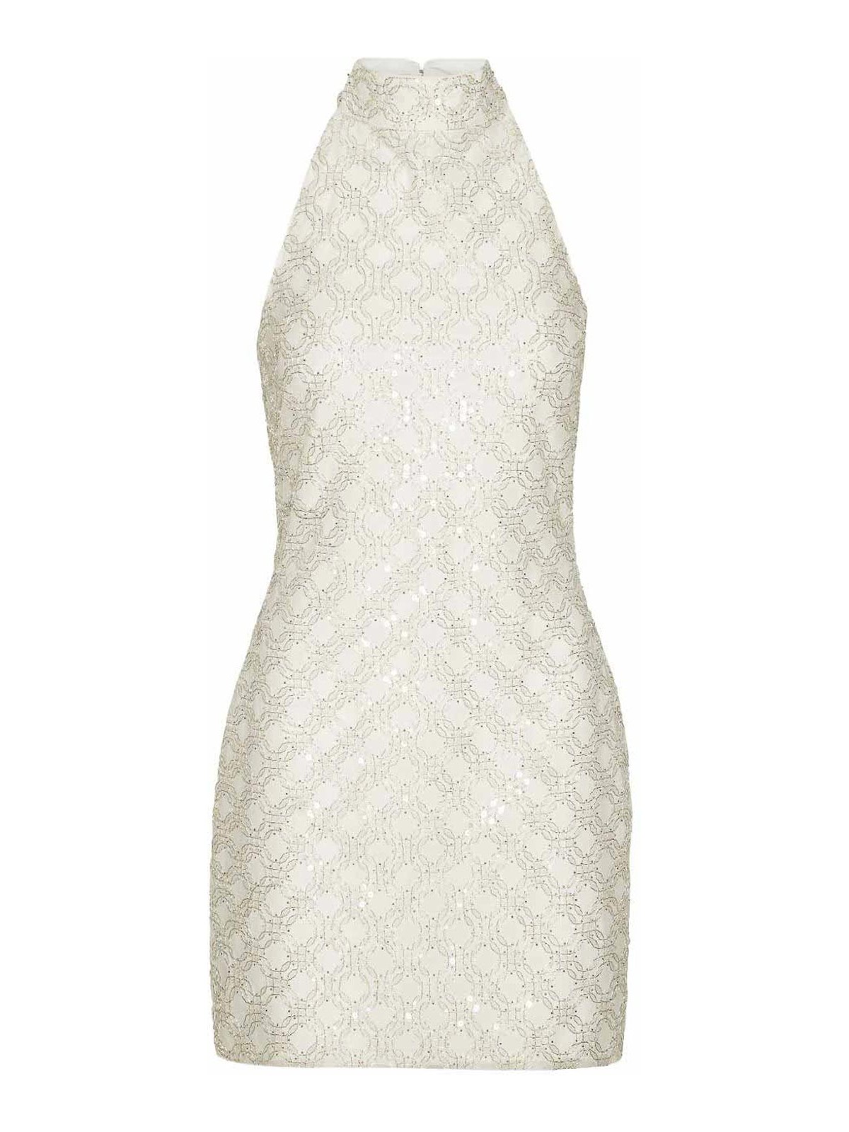 Rotateの明るく洗練されたクリーム色のミニドレスは、全体にスパンコールをあしらったフィット感のあるデザイン、ホルターネックライン、オープンバック、ミニレングス、ローテーション、ミニドレス、スパンコール、リボン付きホルターネック、オープンバックが特徴です