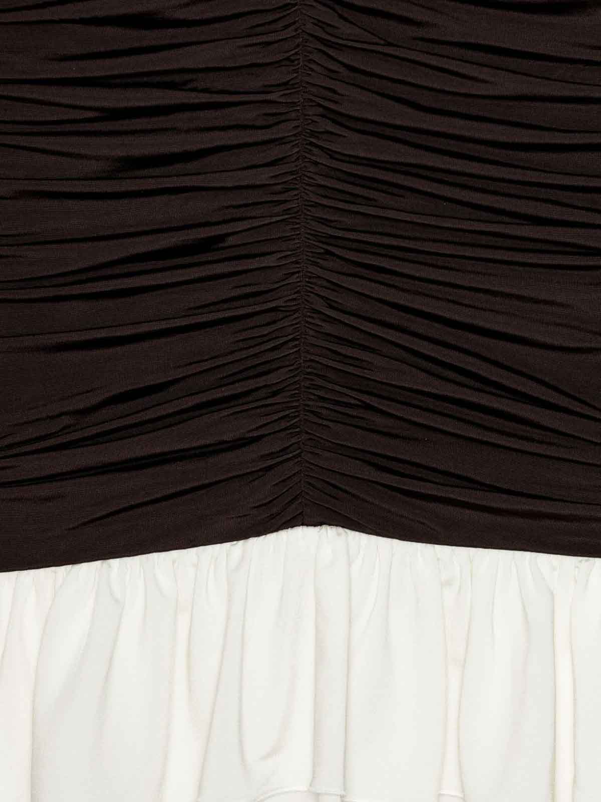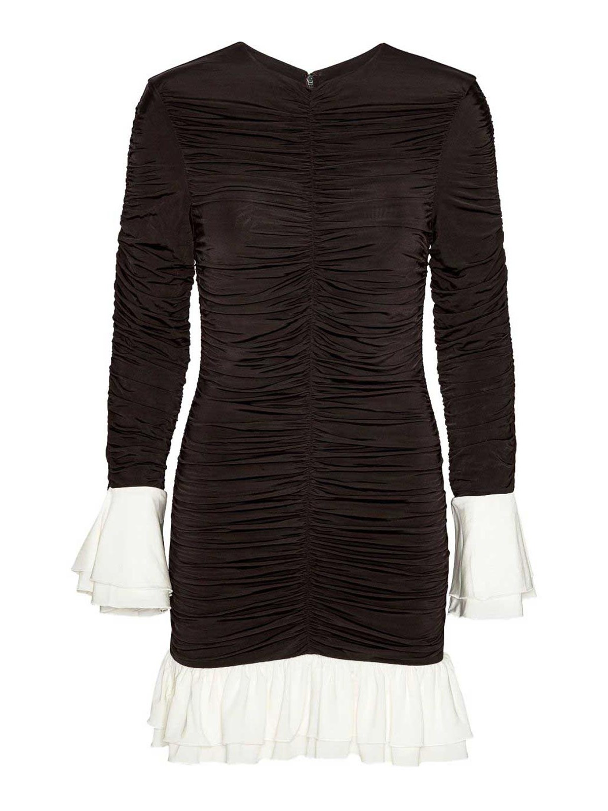 ローテーションのブラウンドレス。ルーシュのディテール、ロングスリーブ、レイヤードカフスとヘム、ジッパーが特徴で、エレガントな構造と質感でシルエットを引き立てる洗練された現代的なアイテムです。