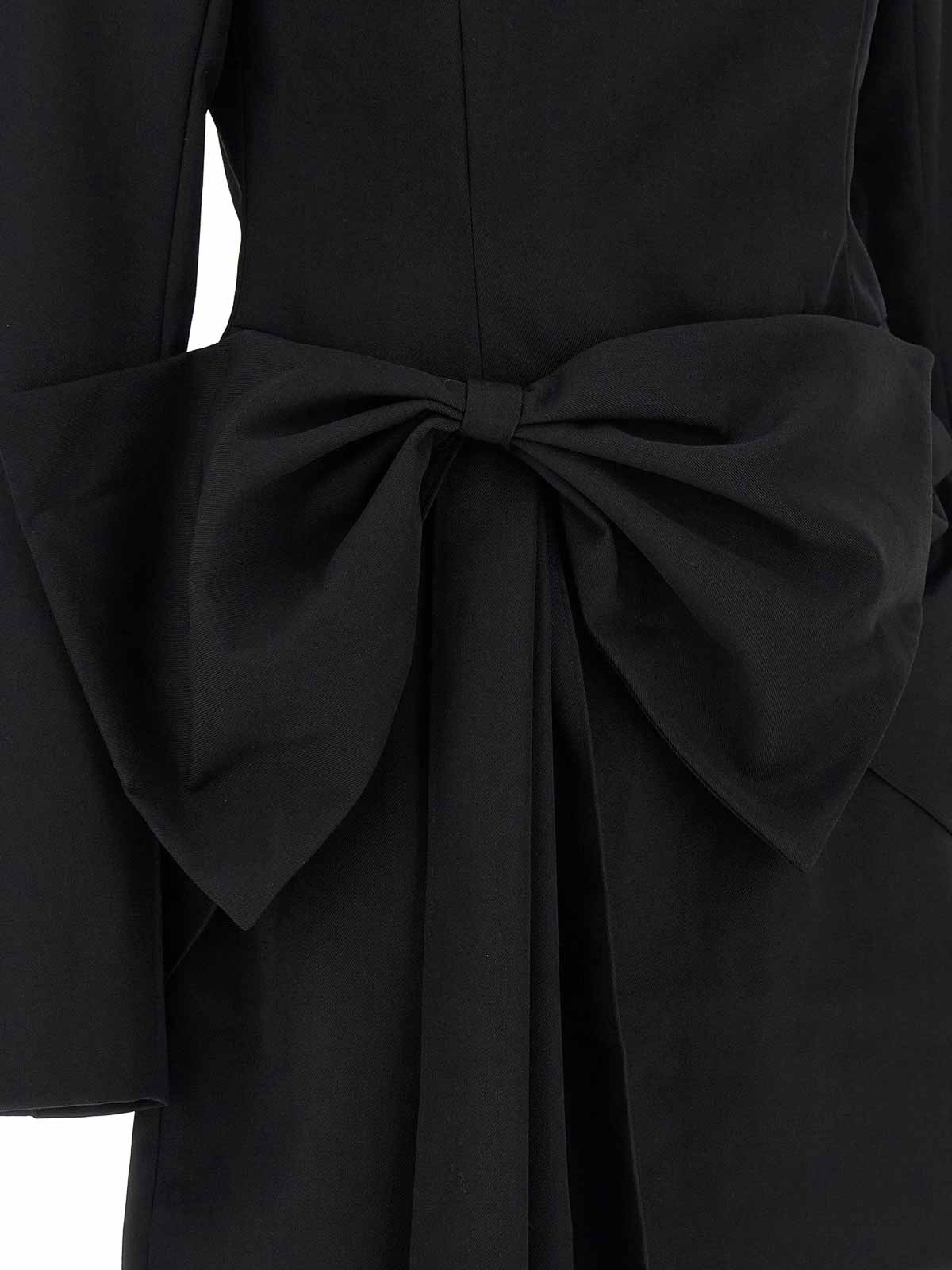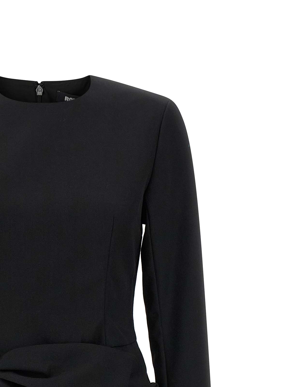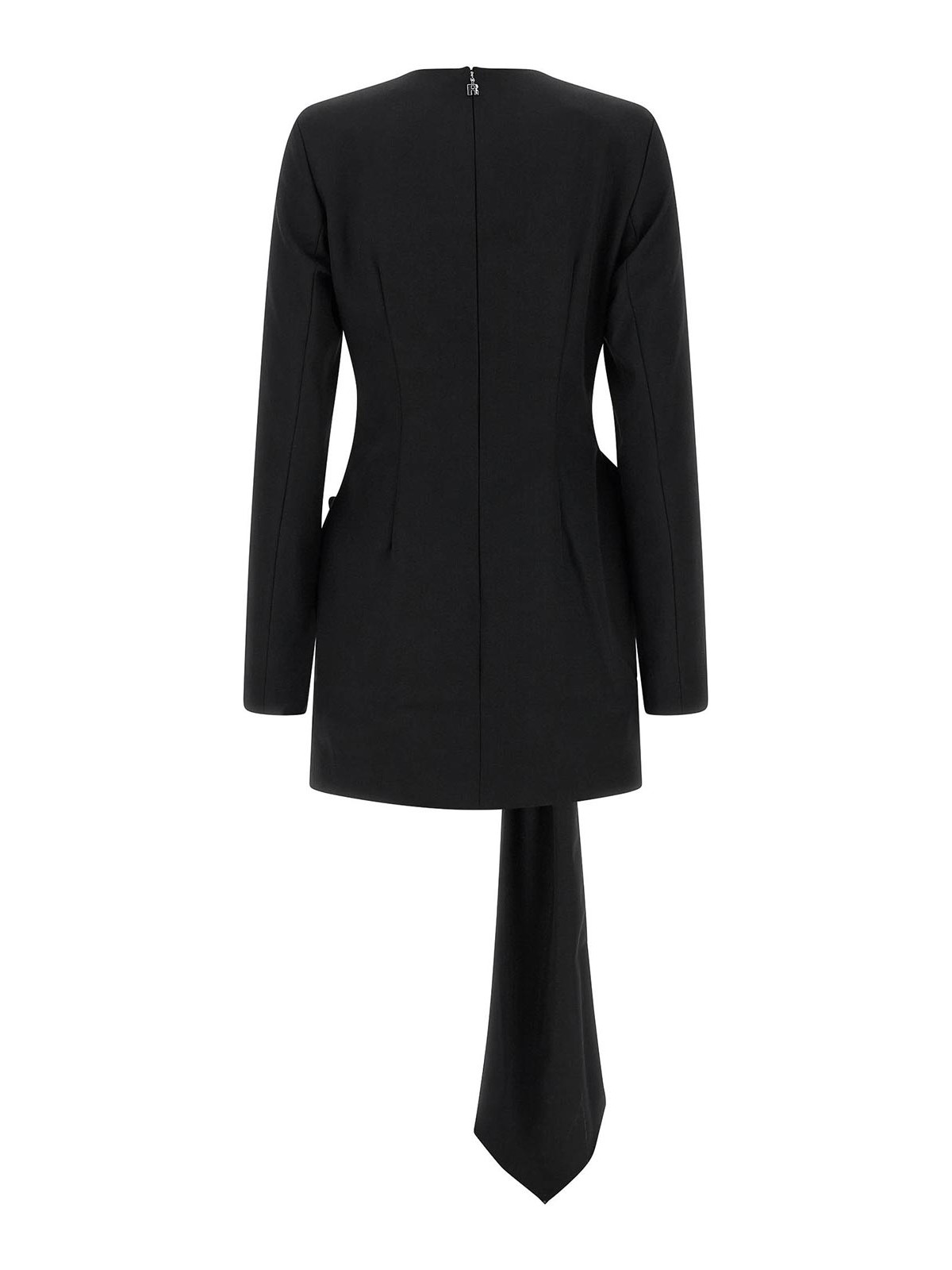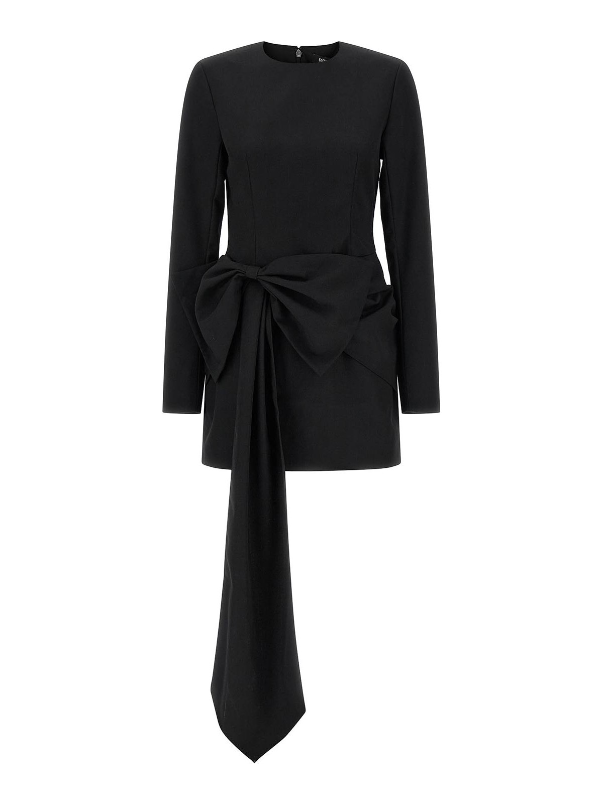 ポリエステルとウール混紡のミニドレス、クルーネック、しっかりとしたショルダーストラップ、ロングスリーブ、バックファスナー、前面にマキシドレープのリボンアップリケ、裏地付き。