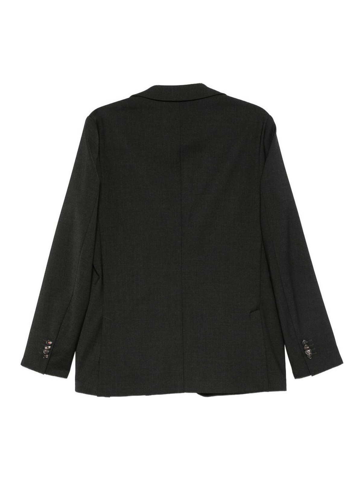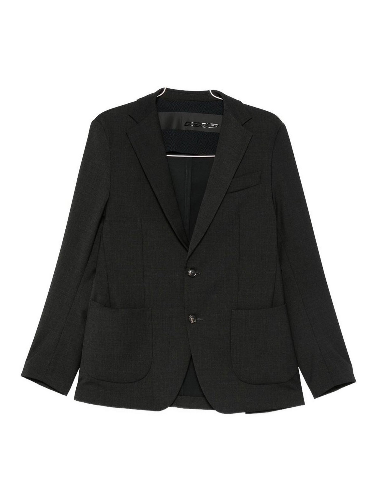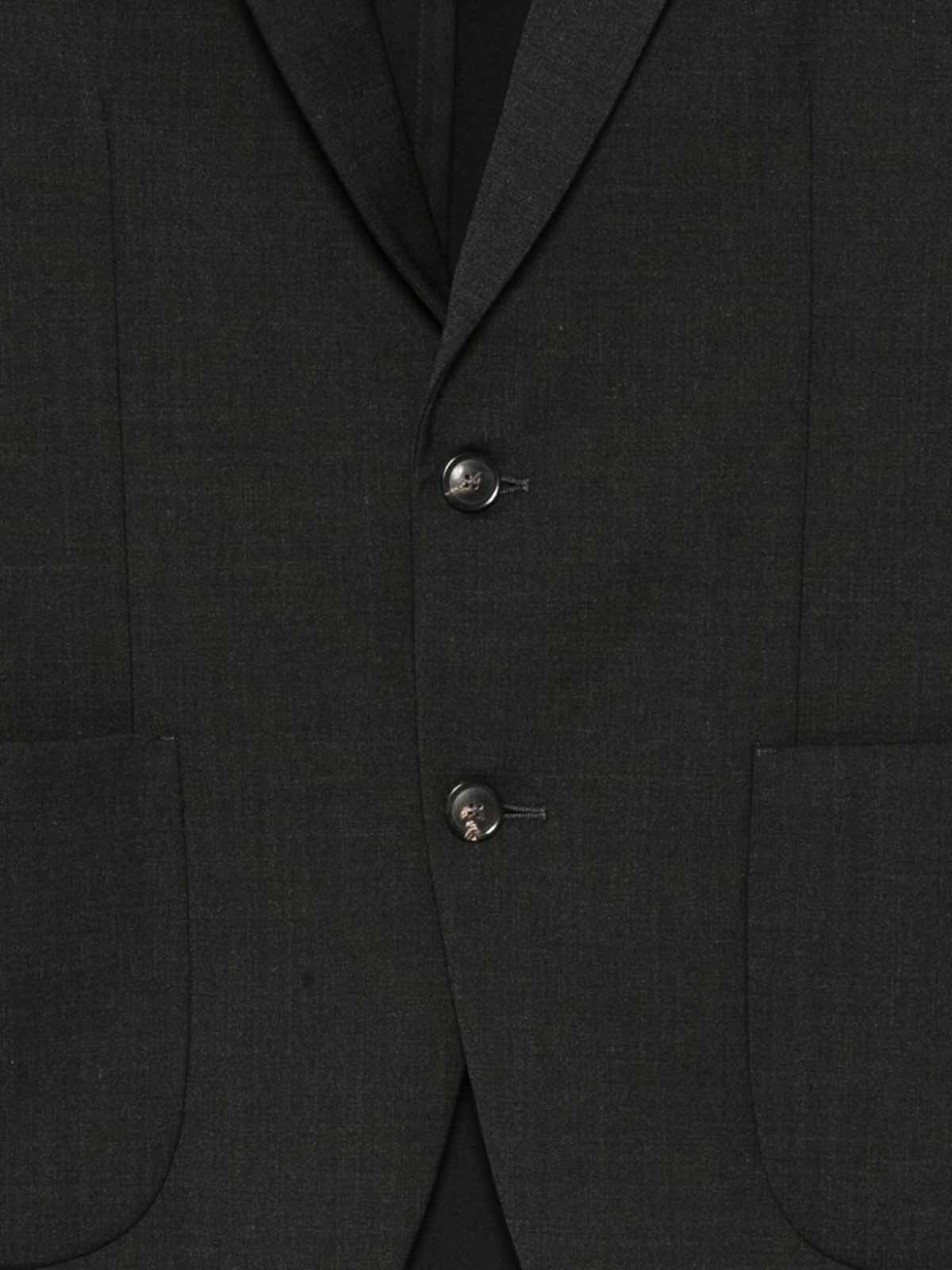 黒いボタンプラケット、胸にウェルトポケット、フロントパッチポケット、ノッチドラペル、ロングスリーブが特徴