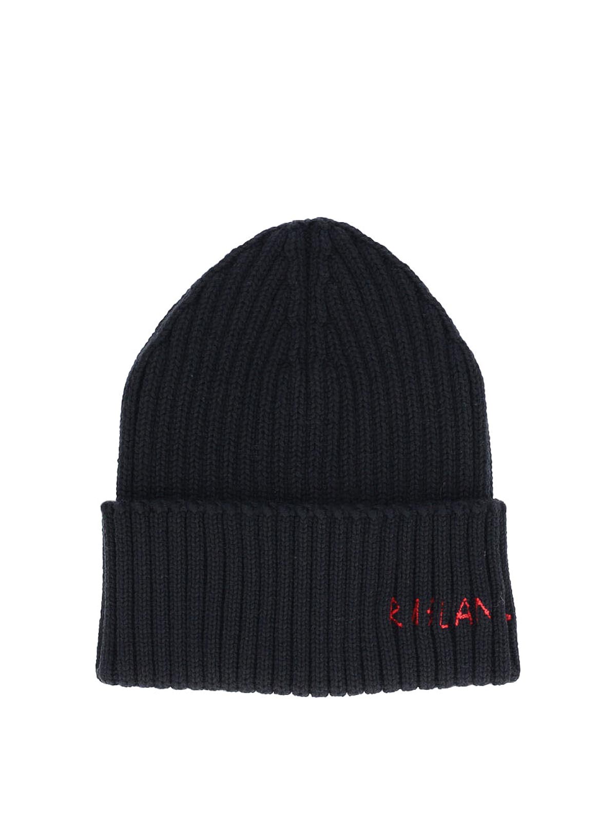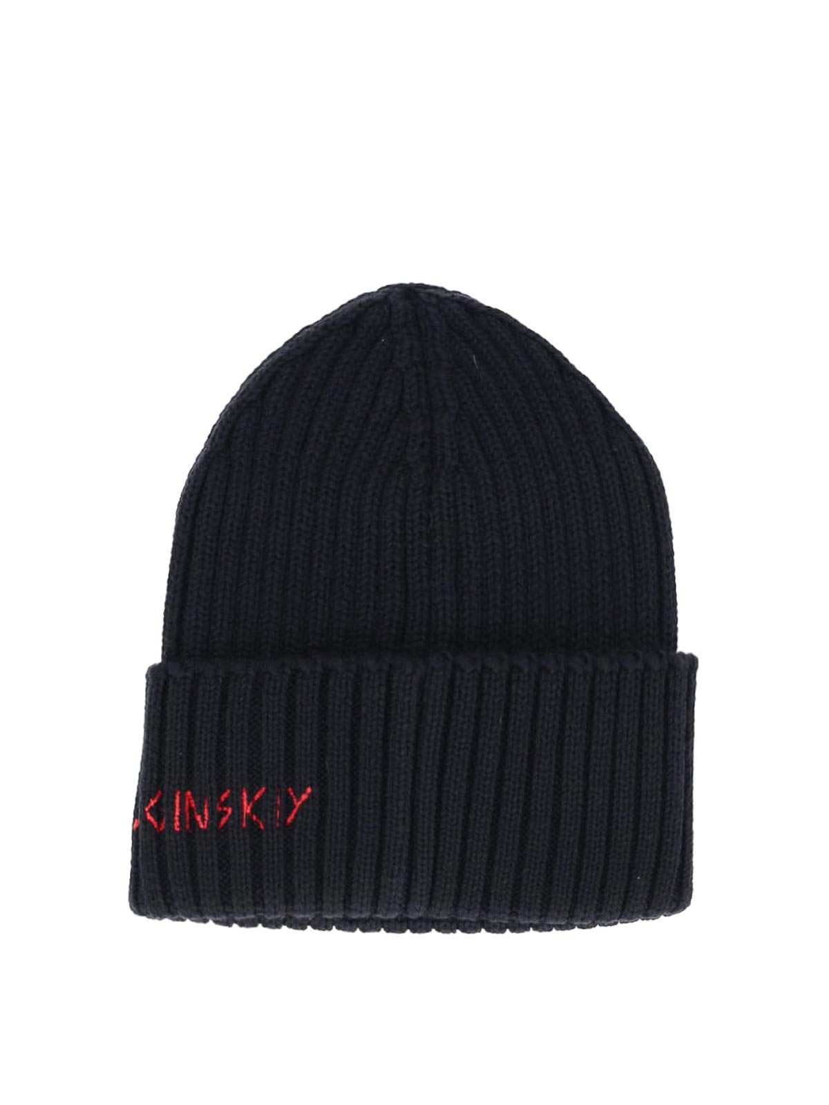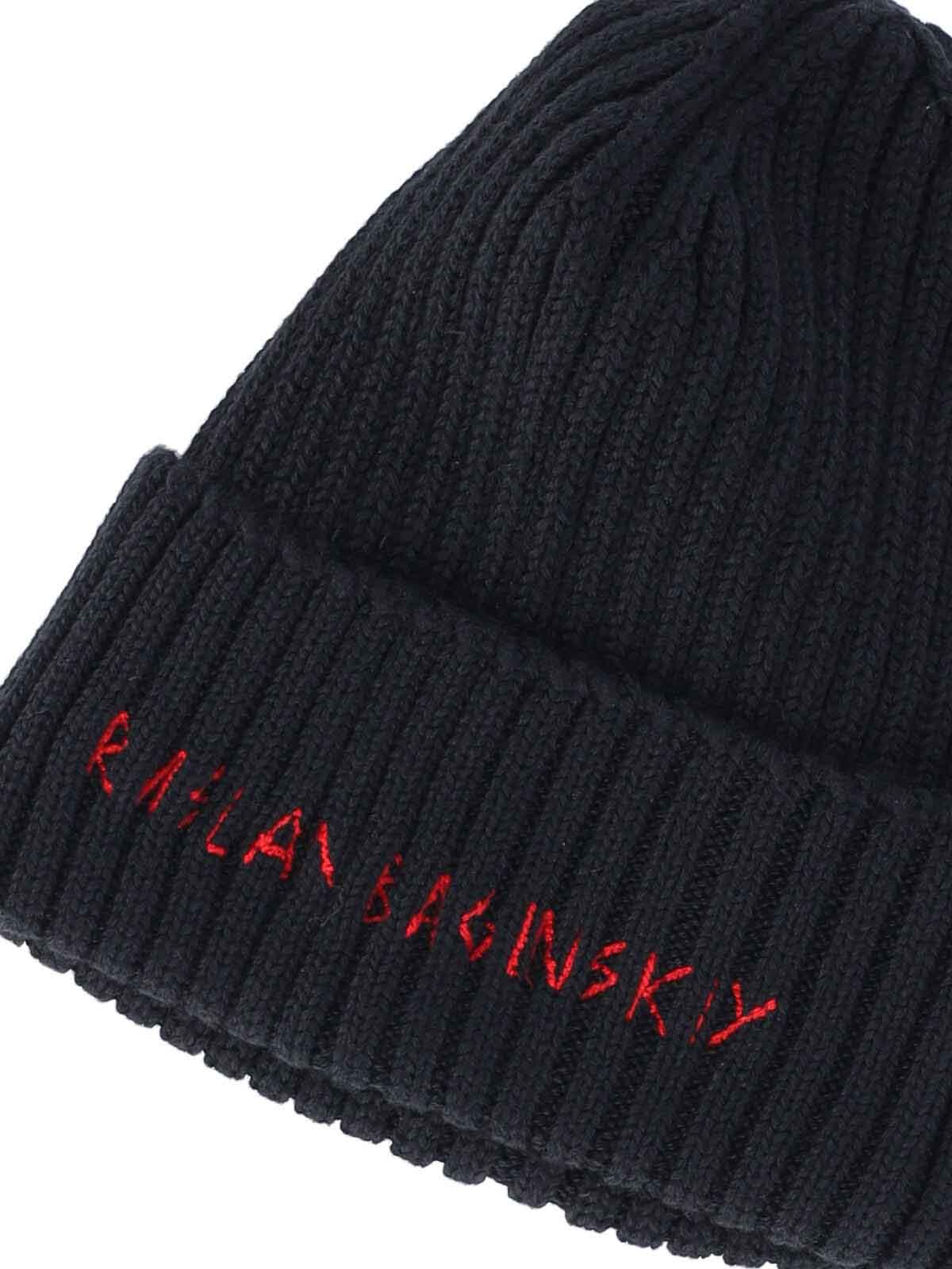 ミックスウールのブロンズロゴ Ruslan Baginskiy、コースト加工、赤いロゴ刺しゅうフェーシング、アスペクトのあるデザイン。
