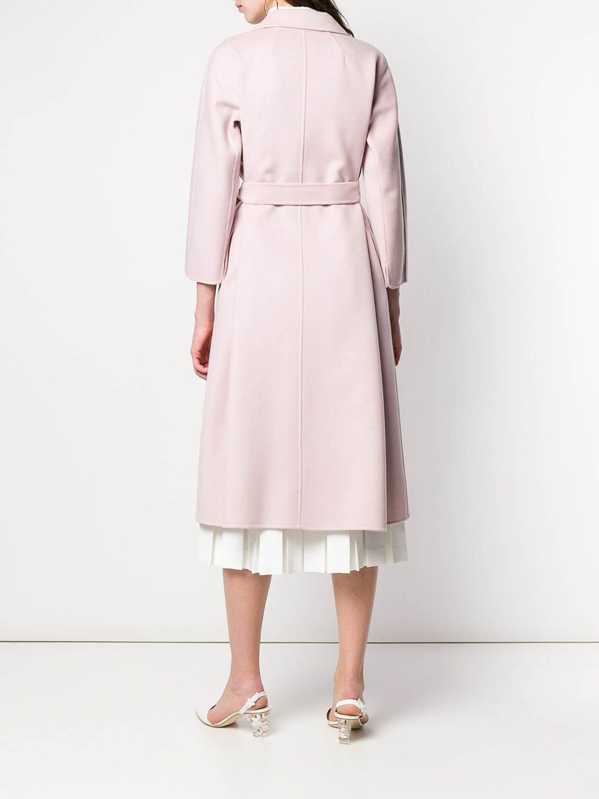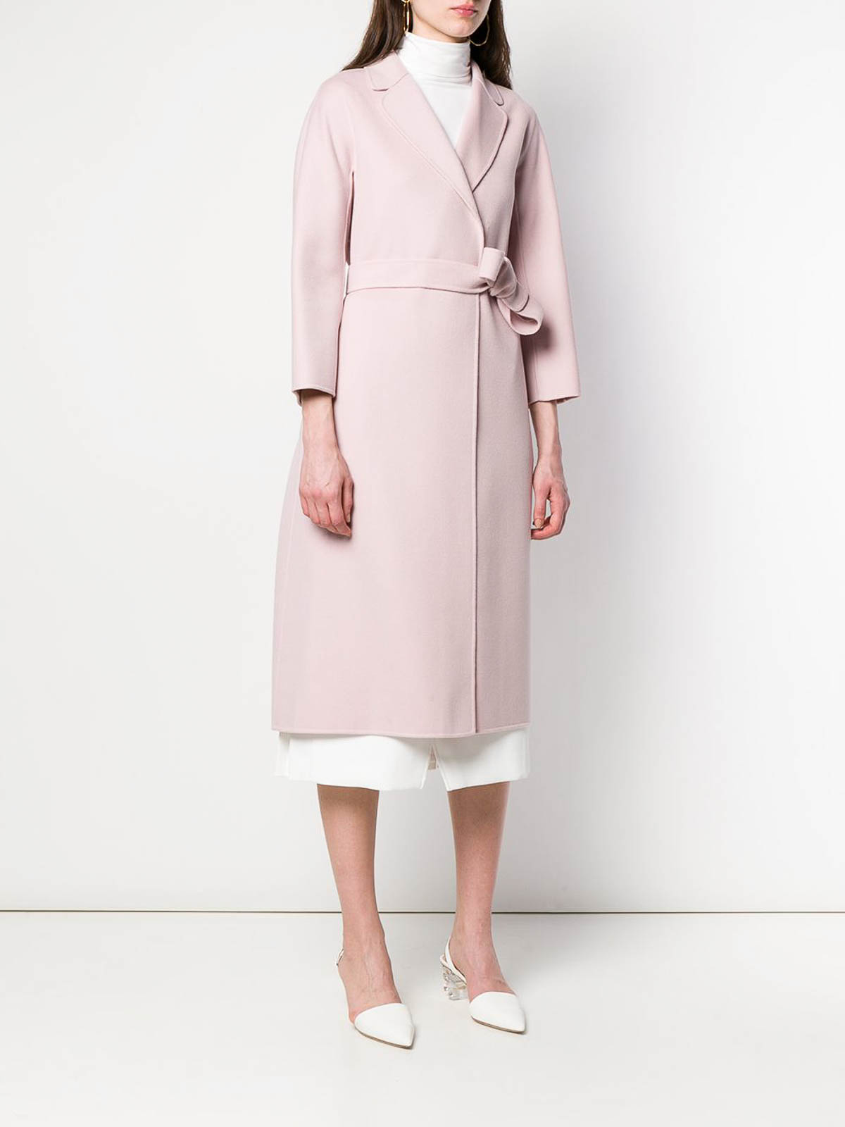 ピンク、スモールラペルカラー、ロングキモノスリーブ、お揃いのベルトをあしらったラップアラウンドファスナー、インシームサイドポケット、裏地なしモデル