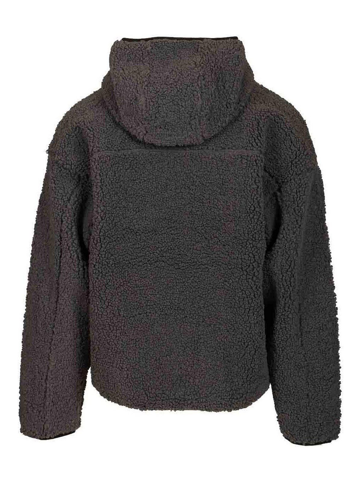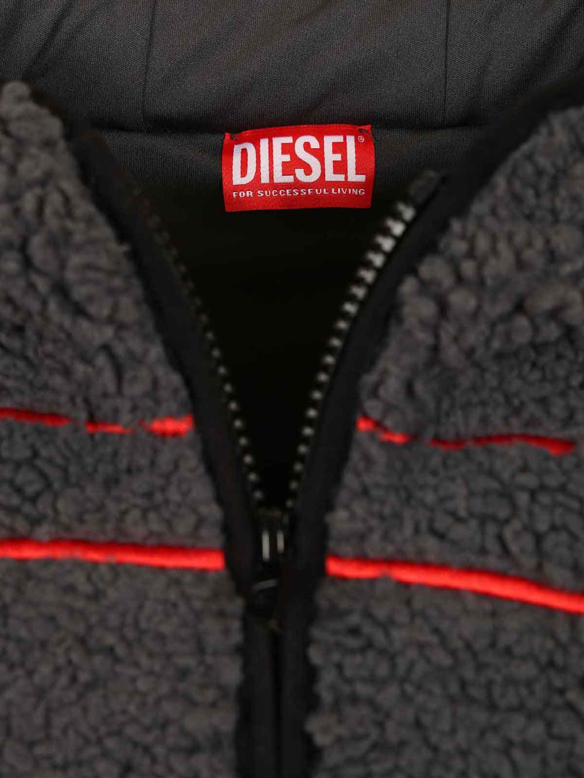 Diesel S, ZATテディパーカー。ジッパーに楕円形のDロゴ入り。縁にはロゴの引き手が付いており、裾の袖口、ファスナーフード、ポケットの開口部にはテープ加工が施されています。
