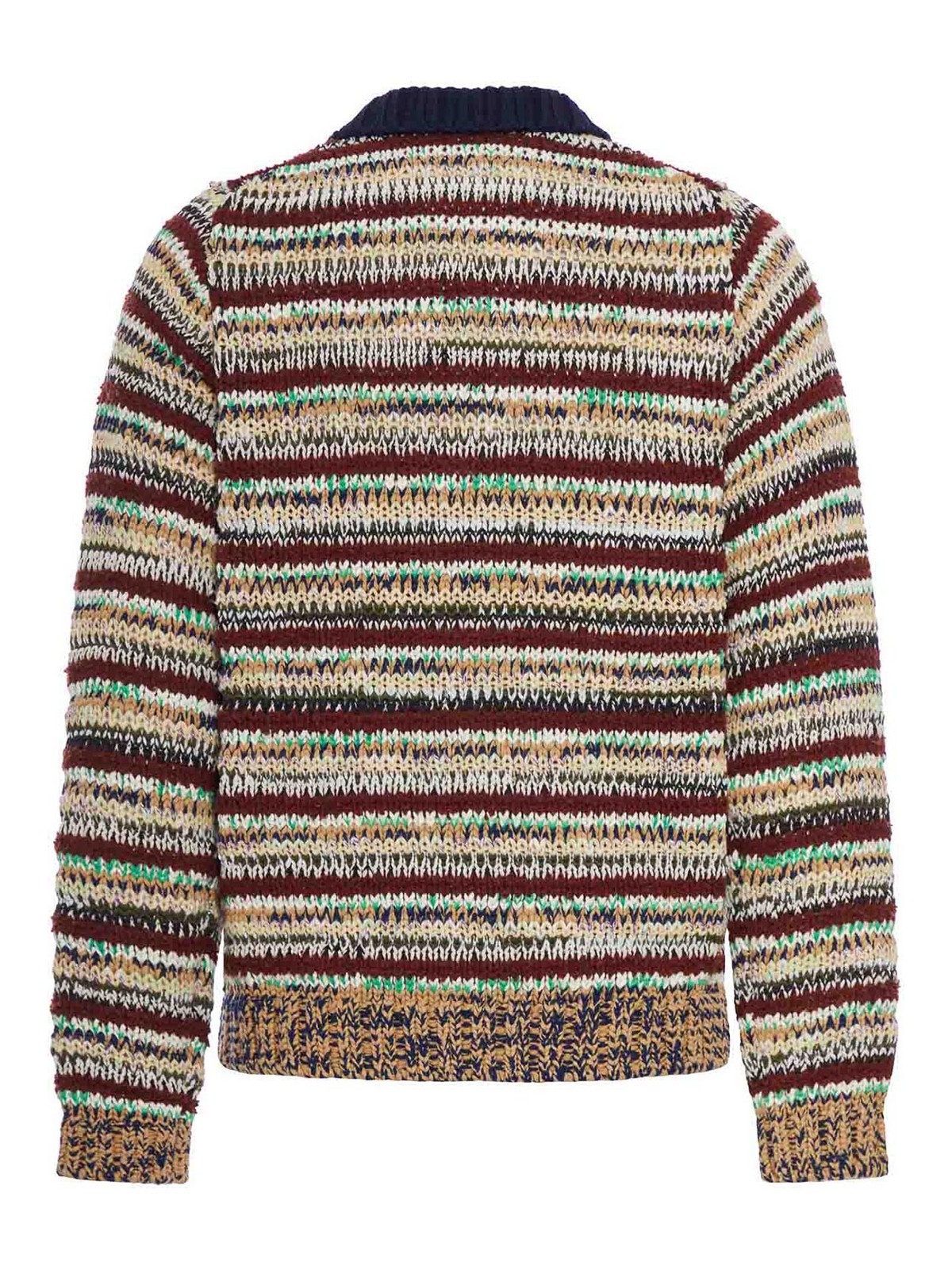 コントラストのあるリブ編みのクラシックなポロネック、部分的にフロントボタン留め、長袖、ドロップアームホール、ミッドウェイトニット、ファズードアウトしたような質感のニット、レギュラーフィット、リブ編みの裾と袖口、マルチカラーのストライプ柄、色:ベージュ/マルチカラー
