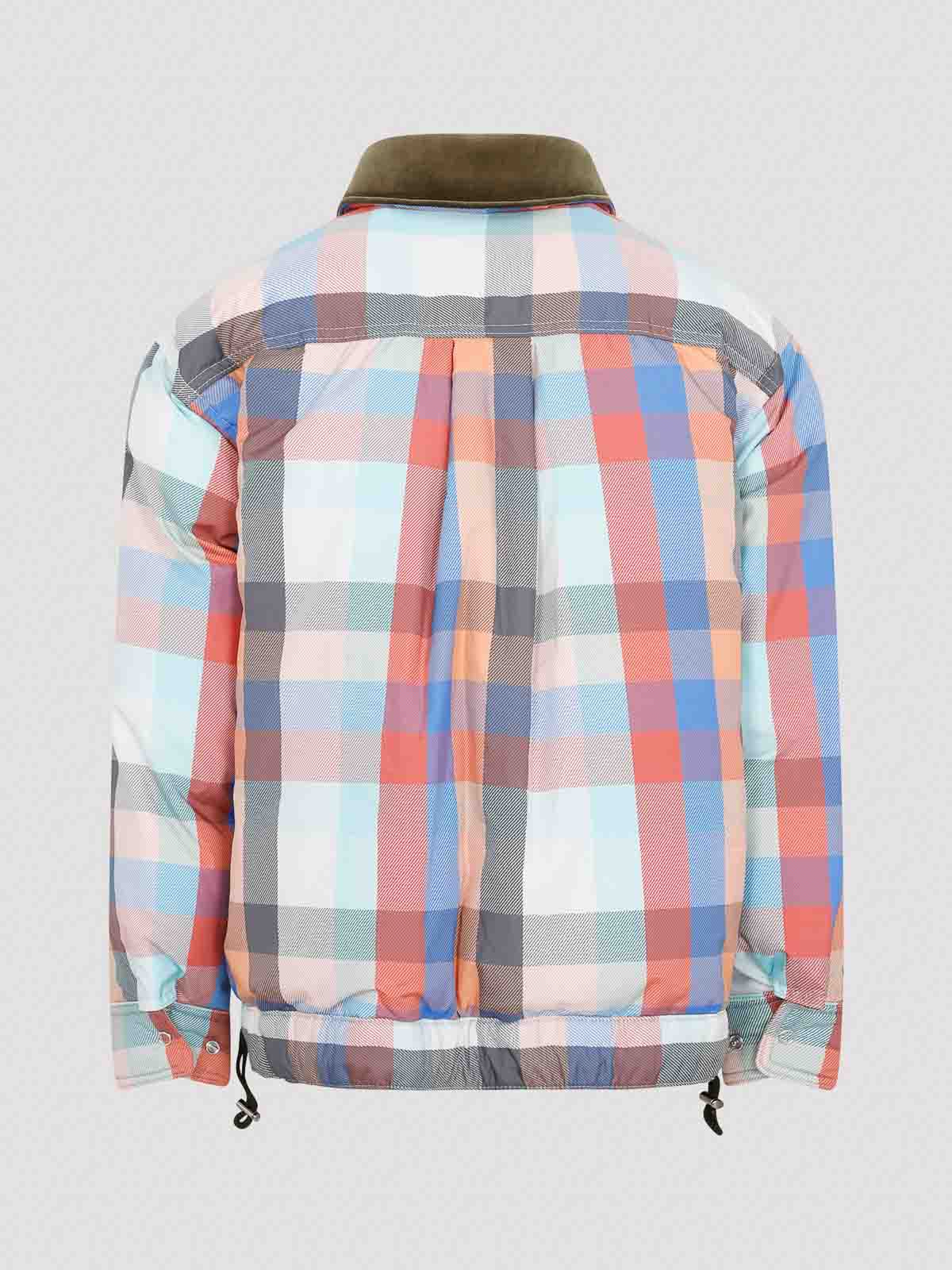 サカイマルチカラーのチェック柄パッド入りブルゾン。ピュアマルチカラーのチェックスタイルのテックファブリックで作られています。先のとがったコントラストの効いた襟、長袖、胸パッチポケット2つ、サイドスリットポケット2つ、サイドスリットポケット2つ、袖口はスナップボタンで留めることができ、ブルゾンは前面にスナップボタンで留めることも、コードロックで固定されたドローストリング付きのダブルジッパー付きの伸縮性のあるストレートヘムで留めることもできます。