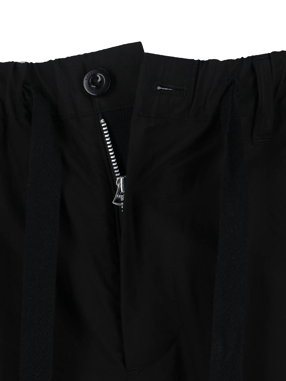 ブラックコットンのSacaiカーゴパンツ、ミディアムウエスト、ファスナーとボタン留め、レースディテール、サイドポケット2つ、バックボタンポケット2つ、ストレートレッグ。
