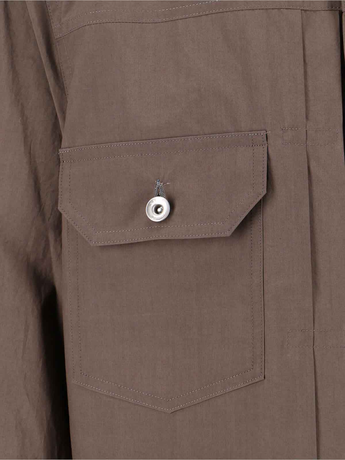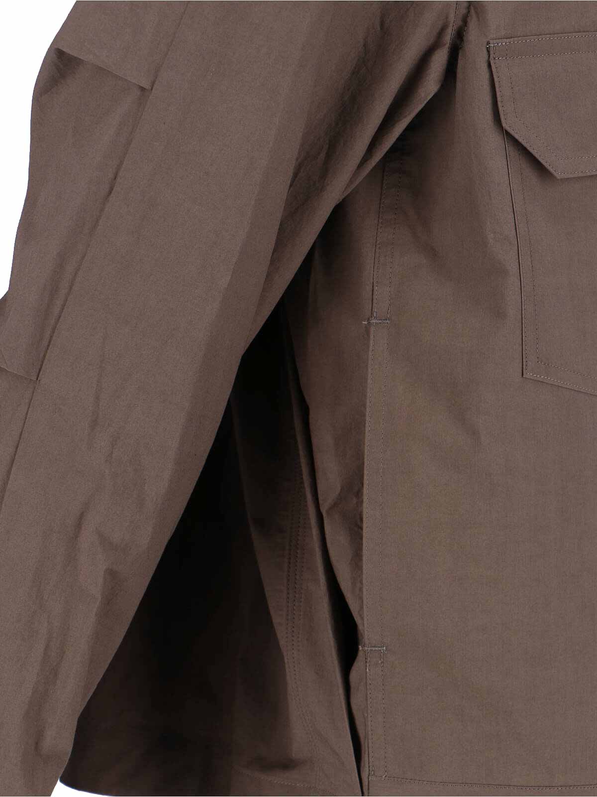 サカイシャツジャケット、ブラウンコットン、クラシックカラー、ボタンクロージャー、フロントボタンポケット2つ、サイドポケット2つ、ボタン付きカフス、ストレートヘム。