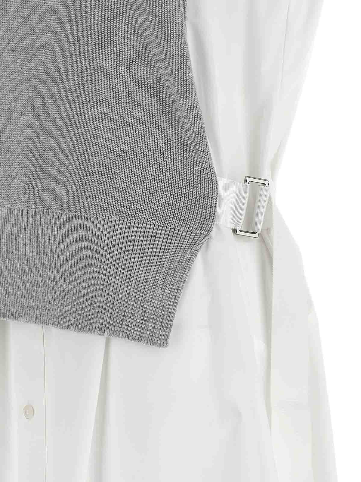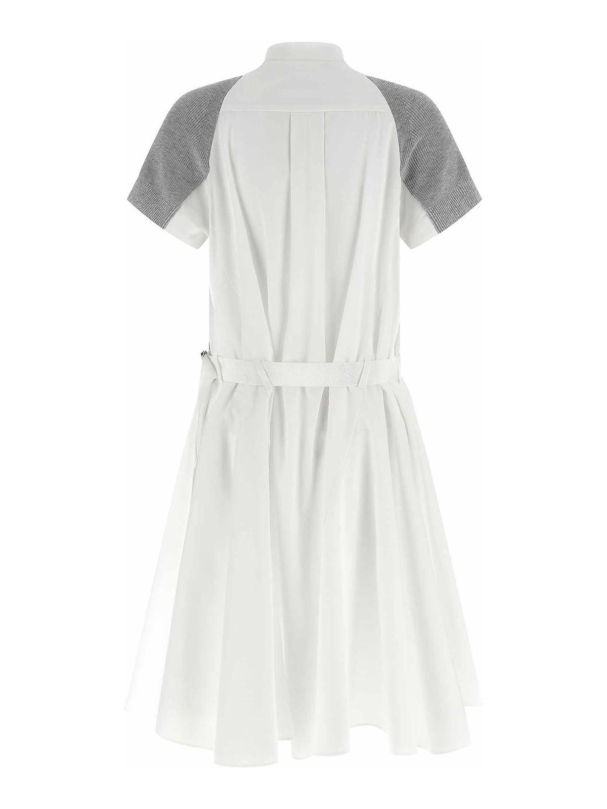 フロントボタン留めのフレアコットンポプリンボディ、ショートスリーブ、取り外し可能なベルト、コントラストの効いたコットン混紡ニット、クルーネックのハイブリッドミディドレス。