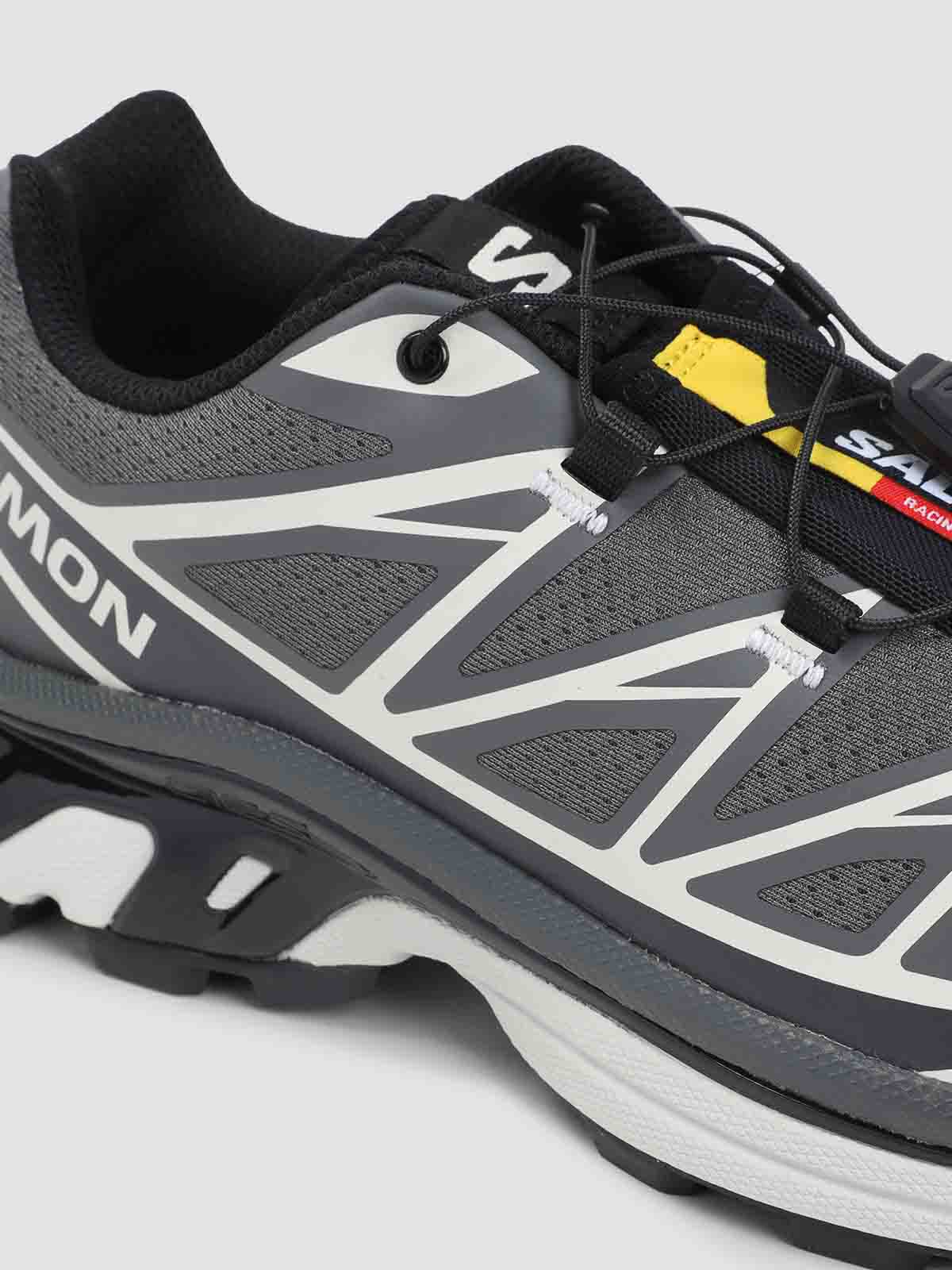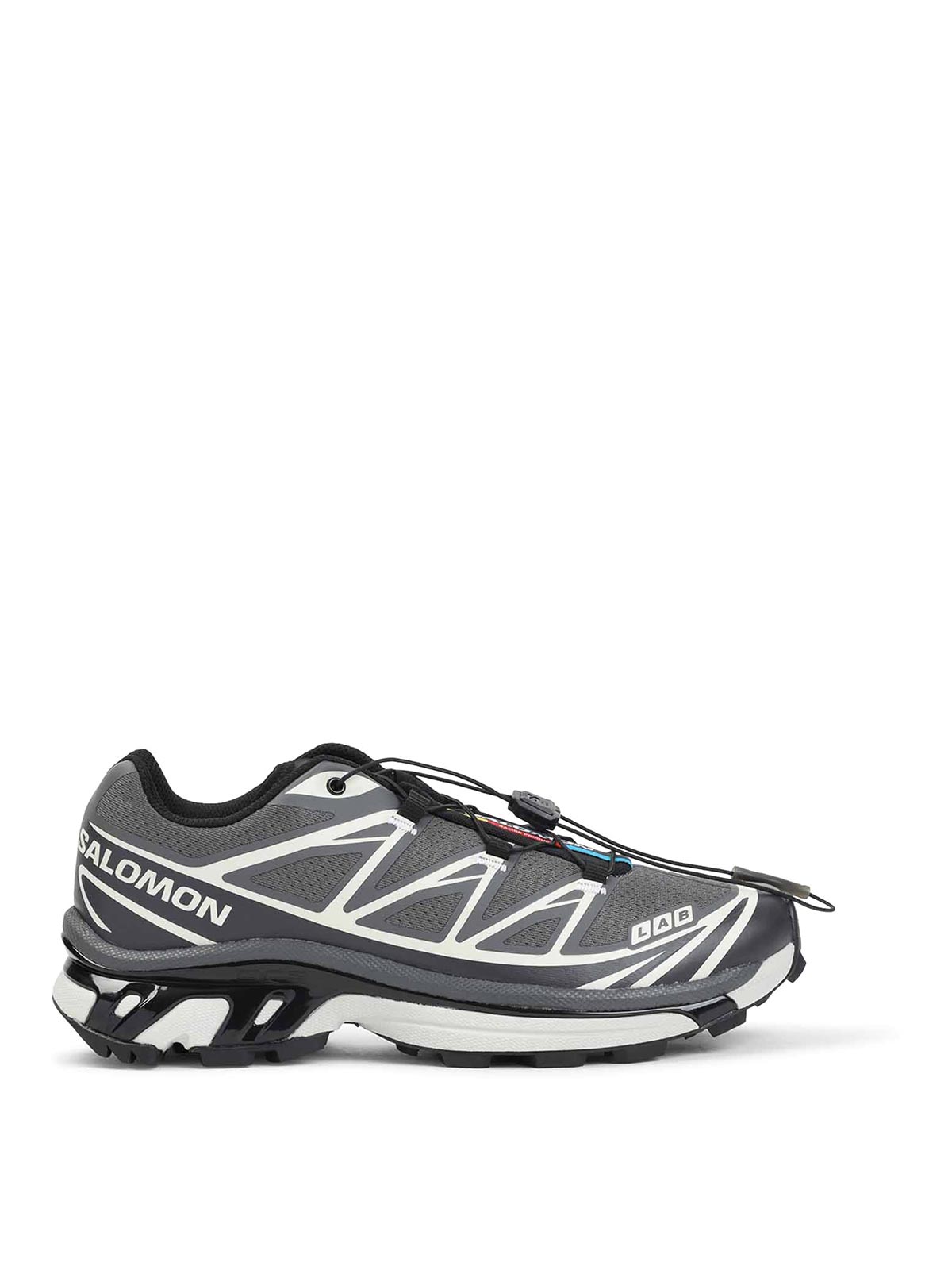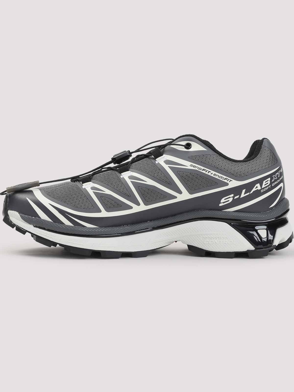 Salomon xt-6グレーのテキスタイルスニーカー。グレーのメッシュに白とグレーのコーティングを施し、丸いつま先、ドローストリング留め、タンにマルチカラーのラベル、サイドにロゴ、EVAインソール、パッド入り裏地、ランニングラバーアウトソールが特徴です。