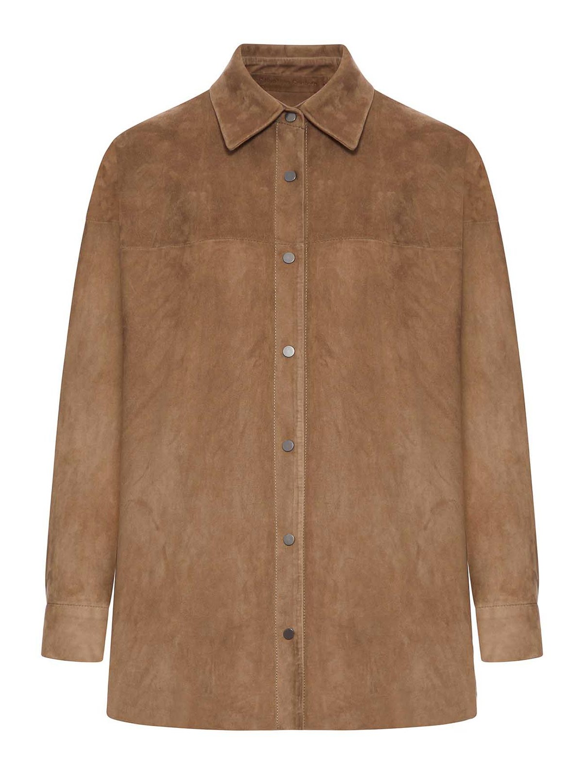 クラシックなシャツカラー、スエード製、スナップボタン付きフロントクロージャー、バックと袖に装飾フリンジ、調節可能なカフス付きロングスリーブ、一体型サイドポケット、ミドルレングス、レギュラーフィット、カラー:クッキー