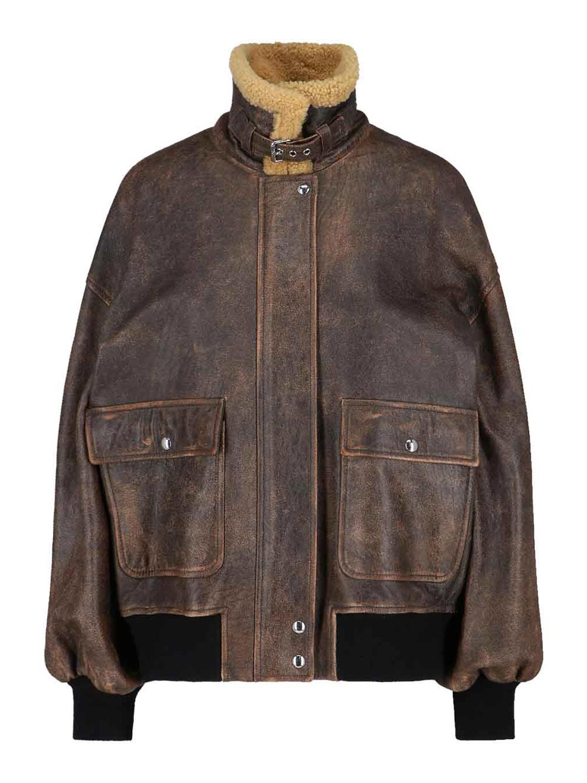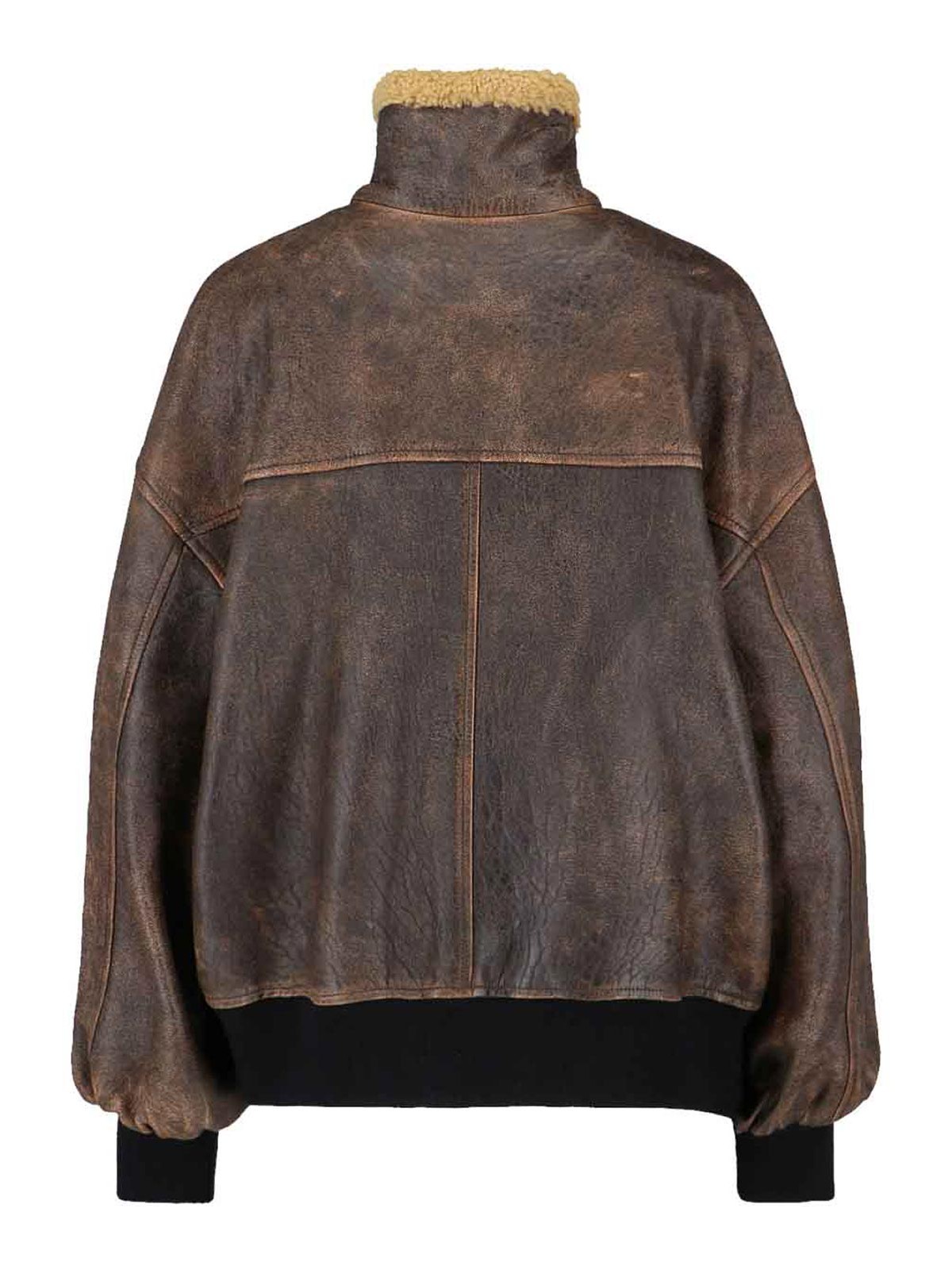 カーテサンドールアビエイタージャケット、ブラウンラムスキン、ウォールドエフェクト、ラムズシアリングトリム、ハイカラー、襟のストラップクロージャー、隠しファスナーとボタンクロージャー、サイドボタンポケット2つ、リブ編みの伸縮性カフス、ストレートヘム。