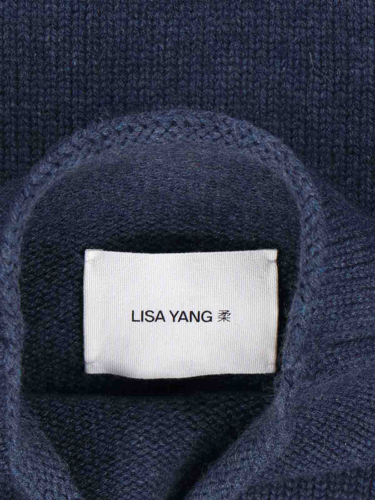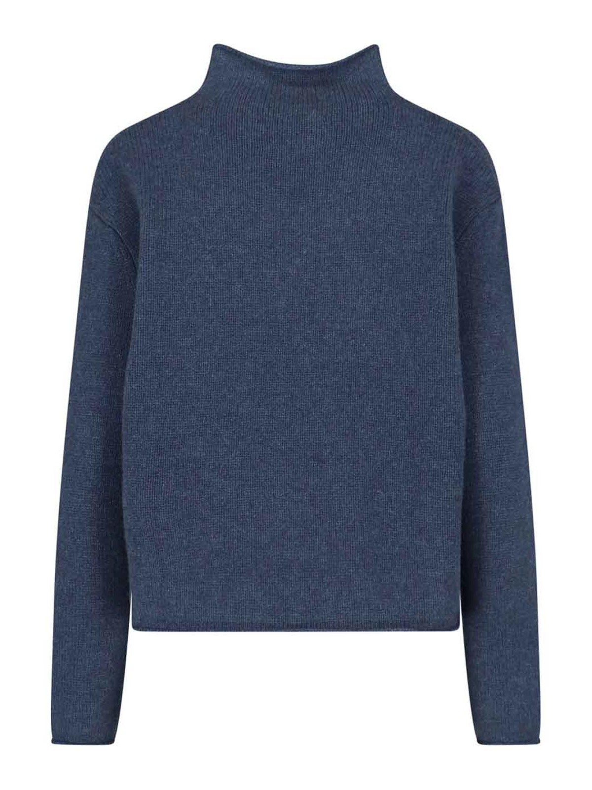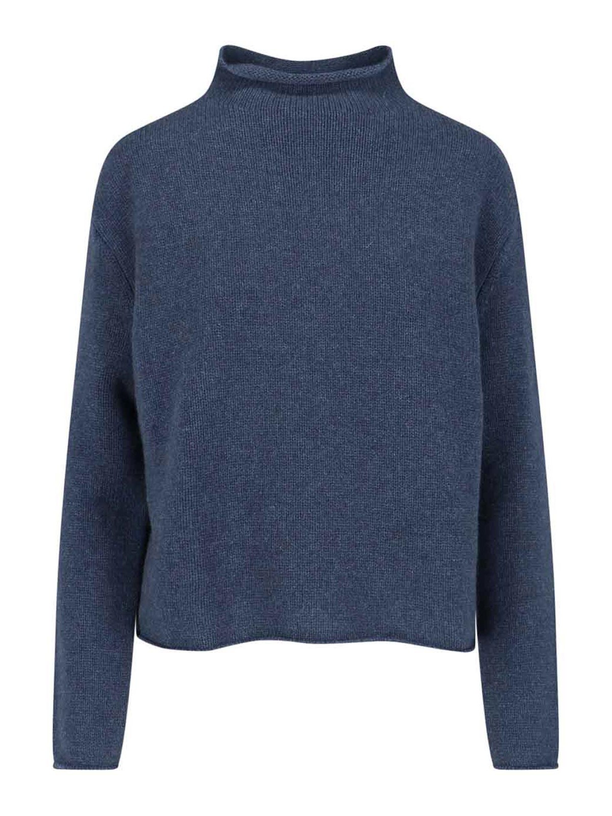 Sandy Lisa Yangセーター、ブルーカシミア、ダークシェード、ハイロールネック、ドロップショルダー、ストレートヘム。