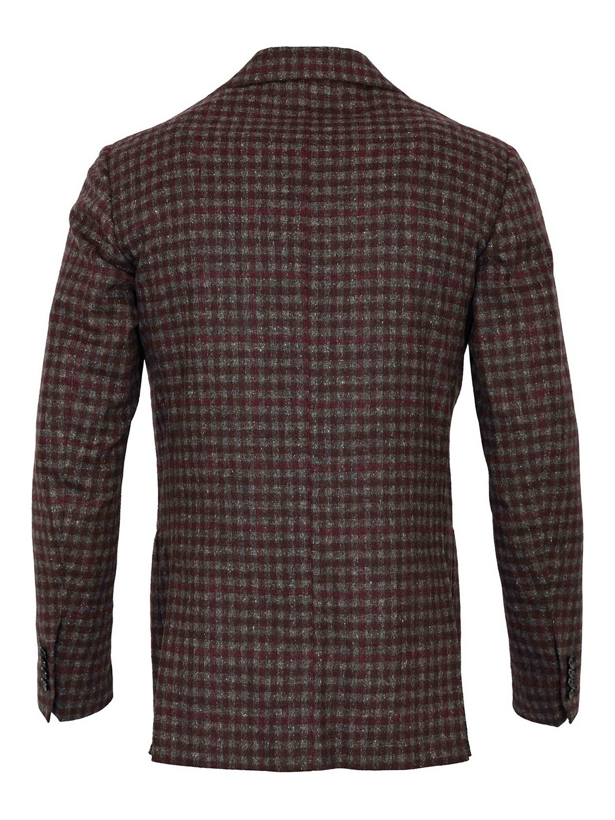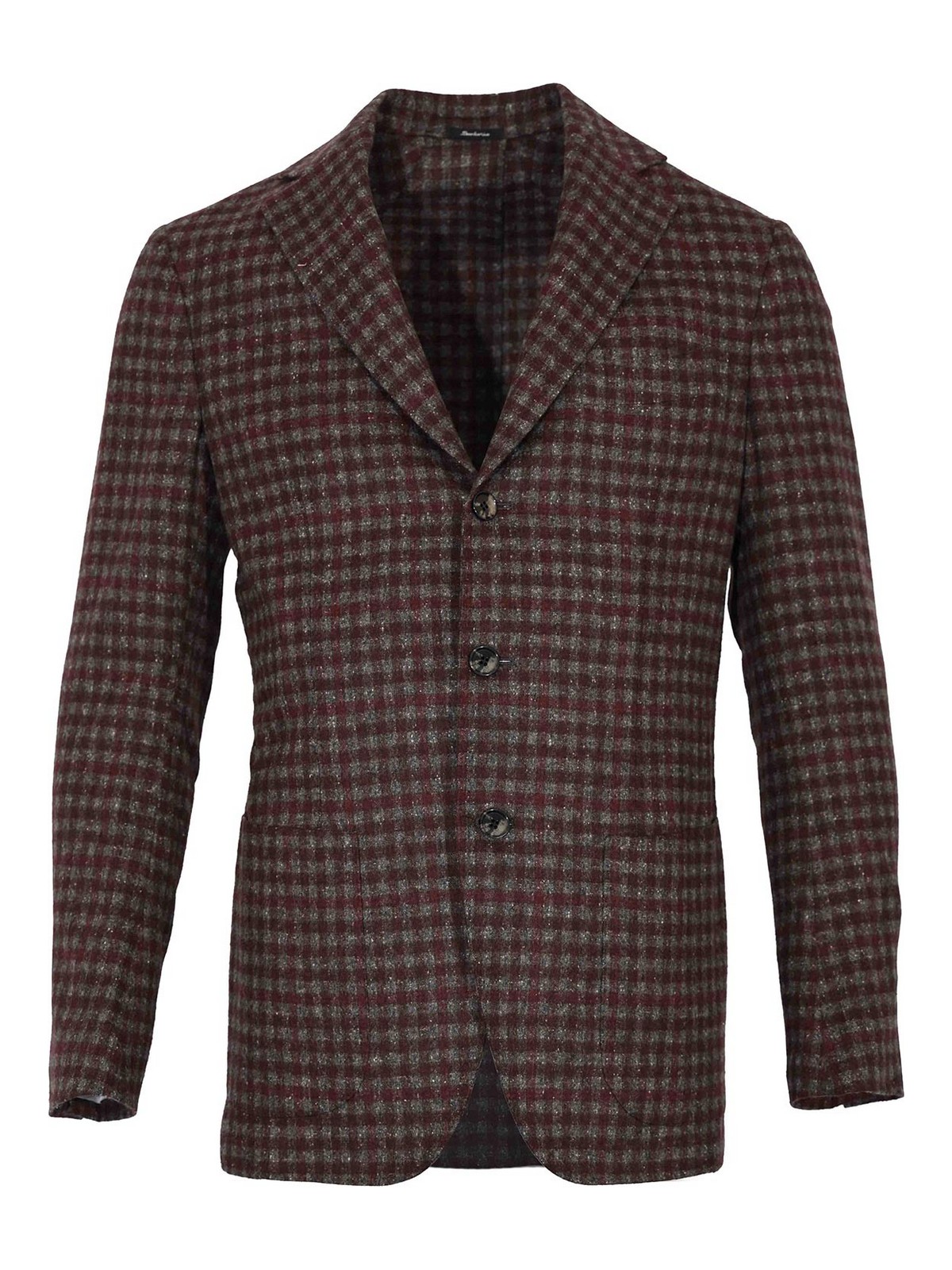 シングルブレストのピュアジャケット。暖かくて柔らかい肌触りのサルトリオモデル。軽量で柔軟な構造で、バーガンディとグレーの色合いのマイクロチェック、袖口にボタン付き、襟にボタン付き、襟にノッチ付きラペル、胸に3つのボタンポケットと2つのパッチポケットと1つのウェルト胸ポケット、露出したテーラードステッチ、背面に通気口がきれいで洗練されたライン。部分的に裏地が付いています。レギュラーにフィットします。