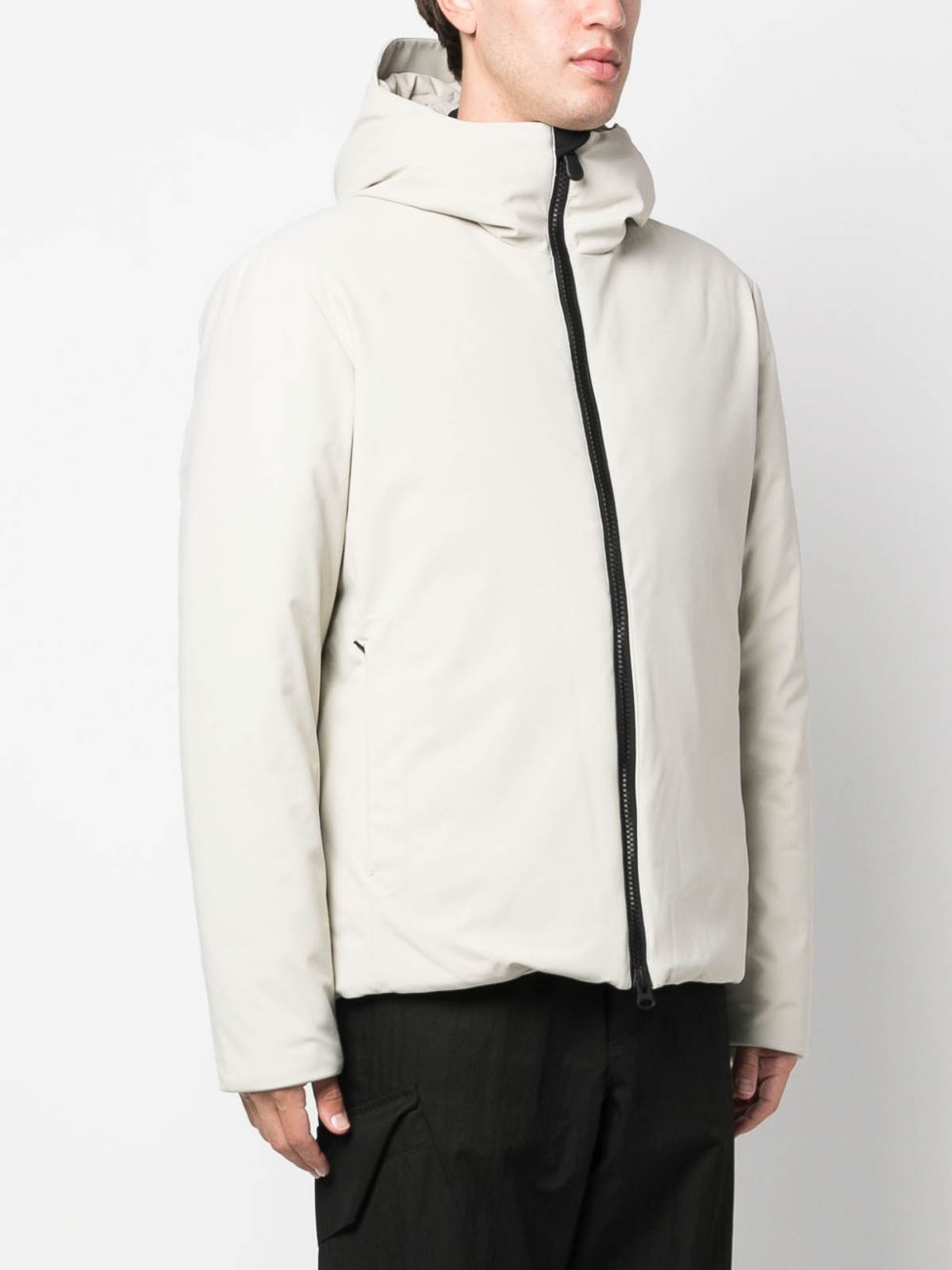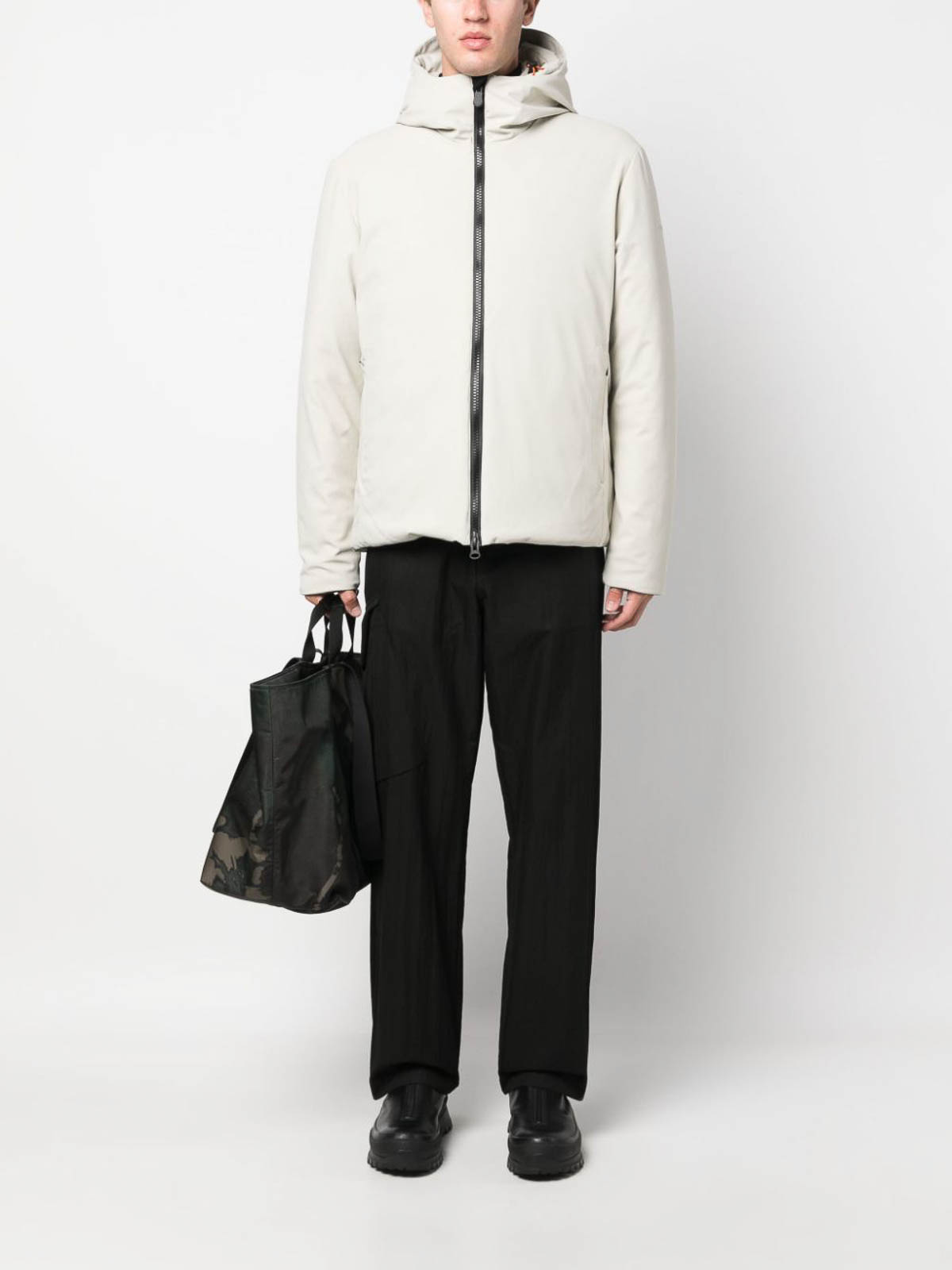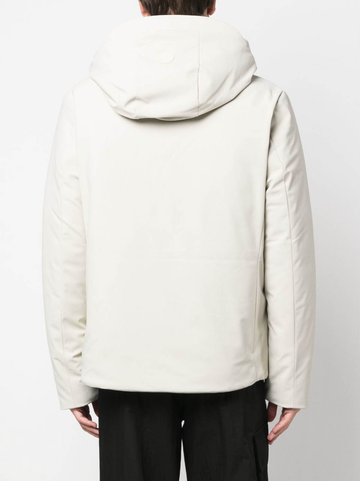 save the のジップアップパッド入りフード付きジャケットは、ライトベージュの混紡ストレッチデザインのパッド入りデザインのドローストリングフード、ファネルネック、双方向ジッパー、長袖、伸縮性のある袖口、サイドにウェルトポケット、伸縮性のある裾が特徴です。