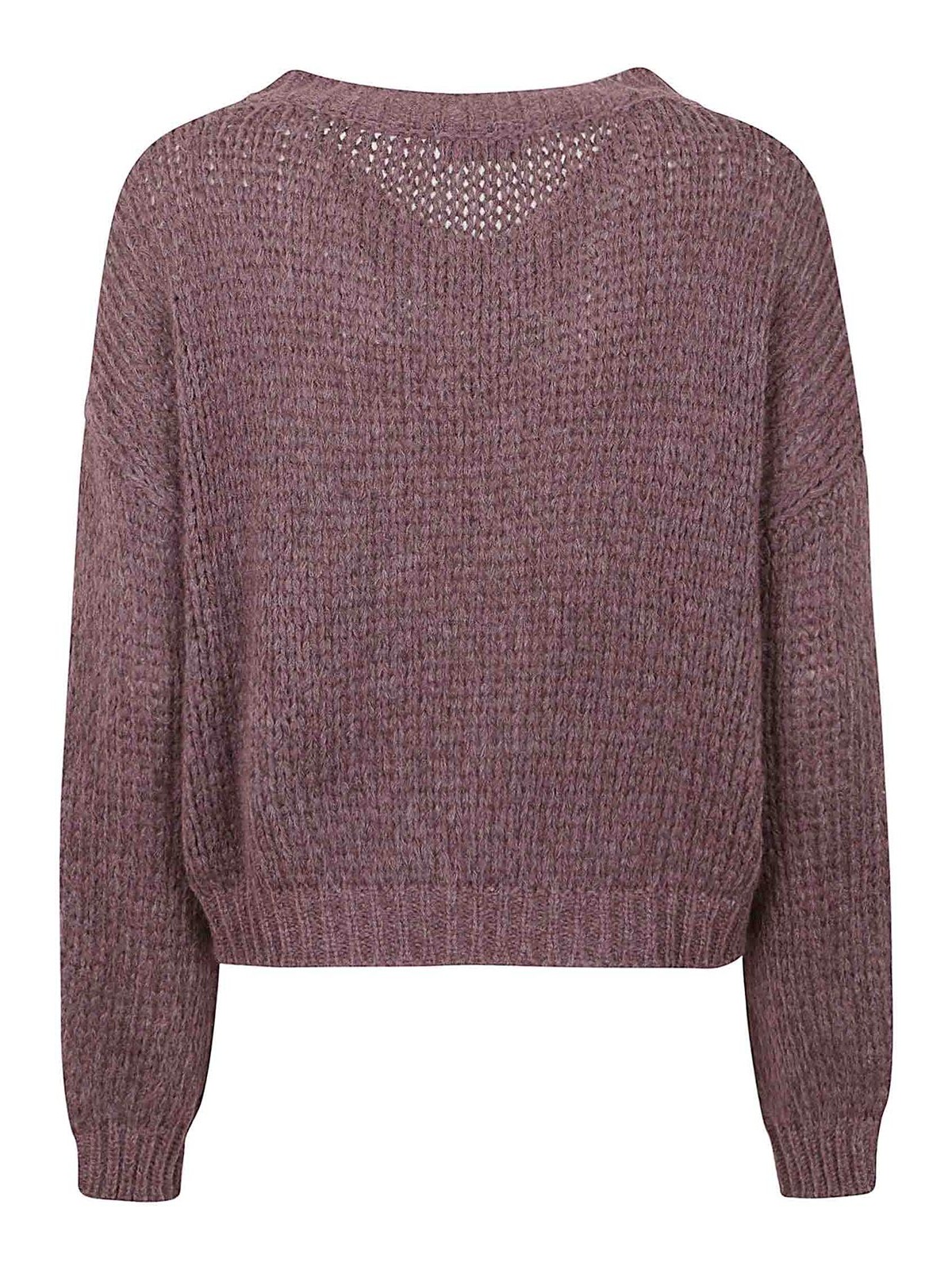 ワインカラーのアルパカウールセーター、Vネック、ボクシーフィット、リブ編みの襟と袖口。