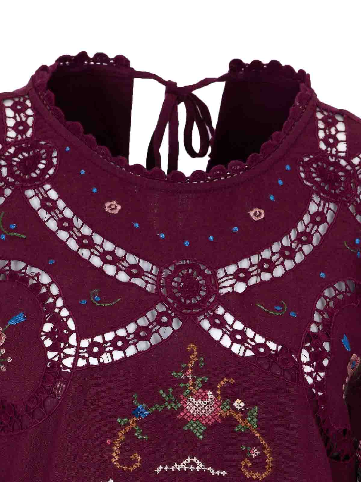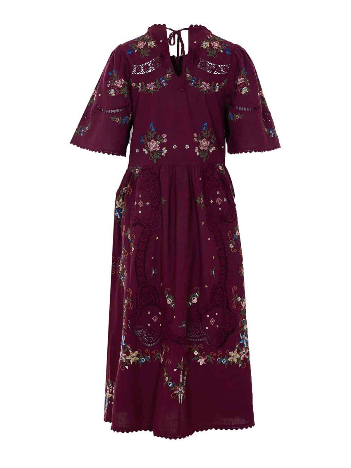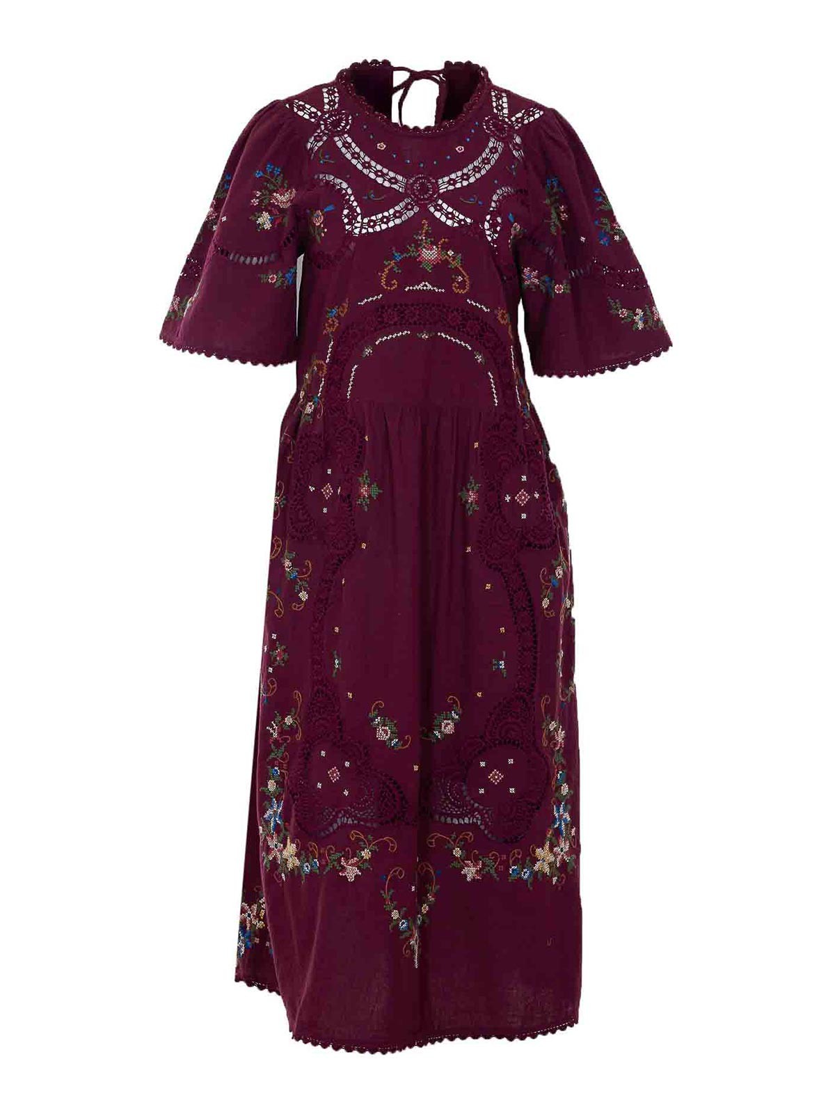 Sea ny Bordeaux エドウィナドレス、Vネック、レースクロージャー、ショートスリーブ、刺繍ディテール、ロングモデル。