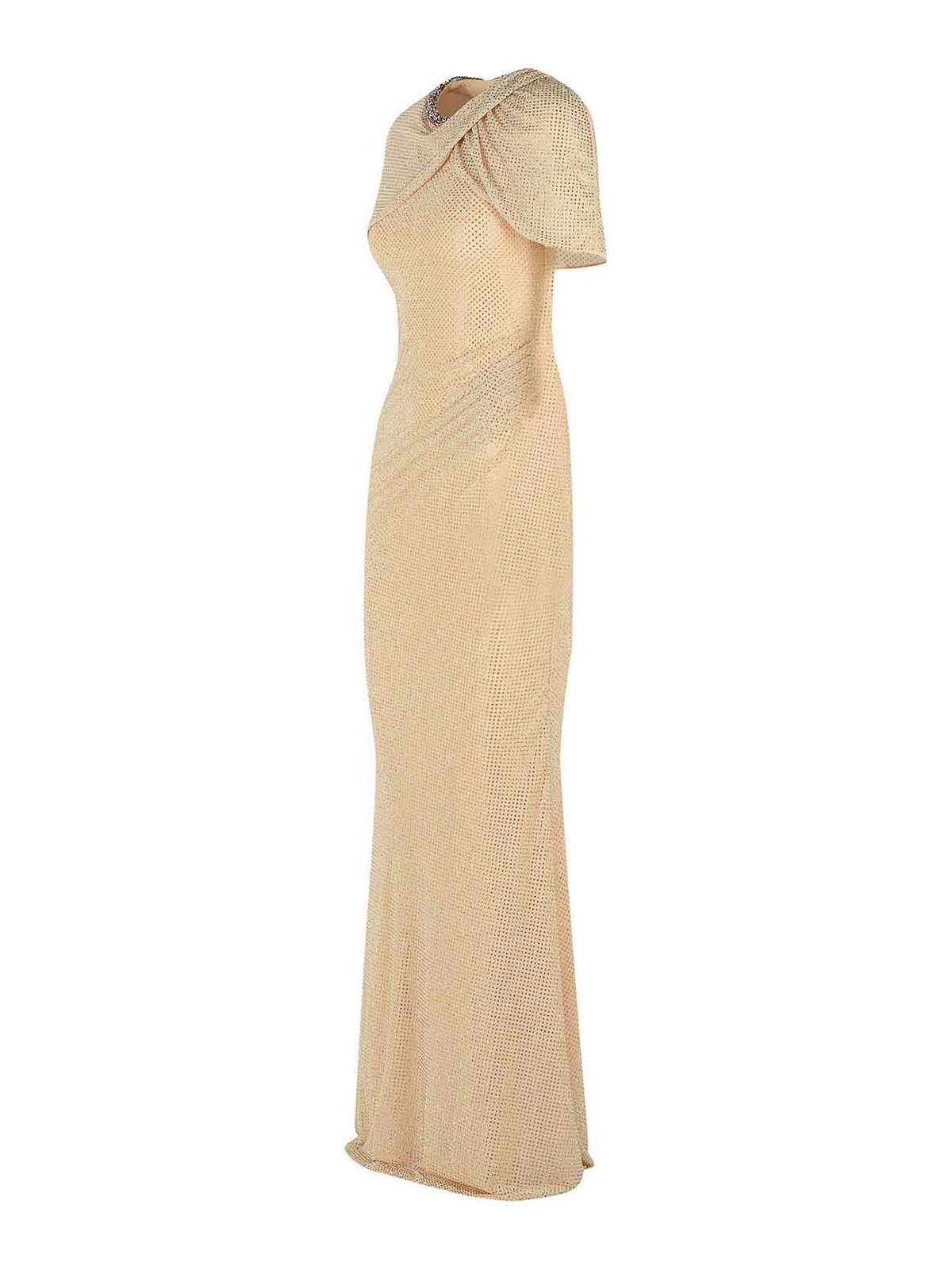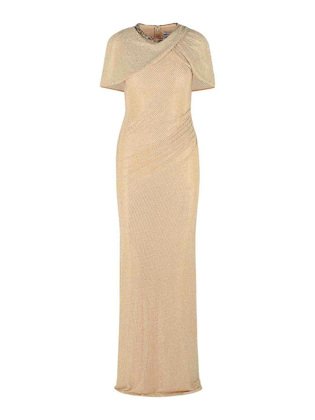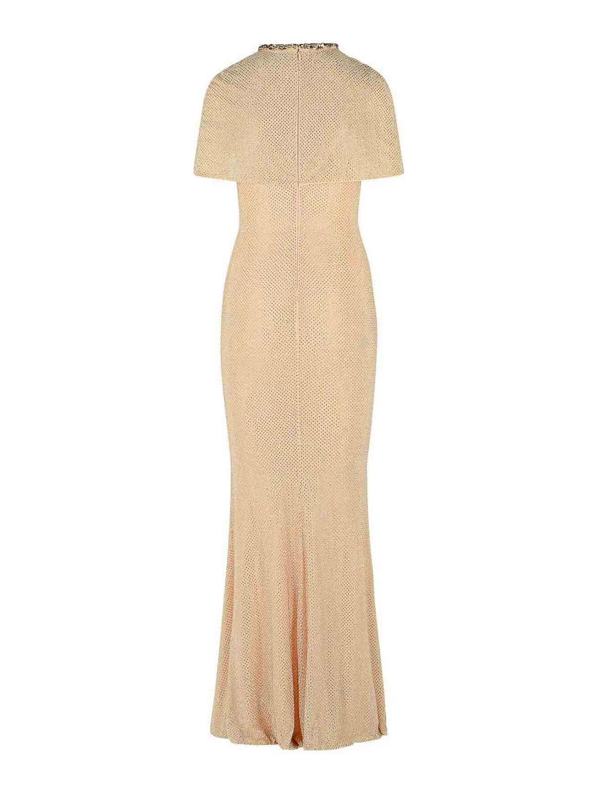 お揃いのラインストーンで覆われたロングドレス、ドレープシュラグ、ダイヤモンドコートの襟付きクルーネック、隠しボタンとジッパー付きのバッククロージャー、サイドドレープ