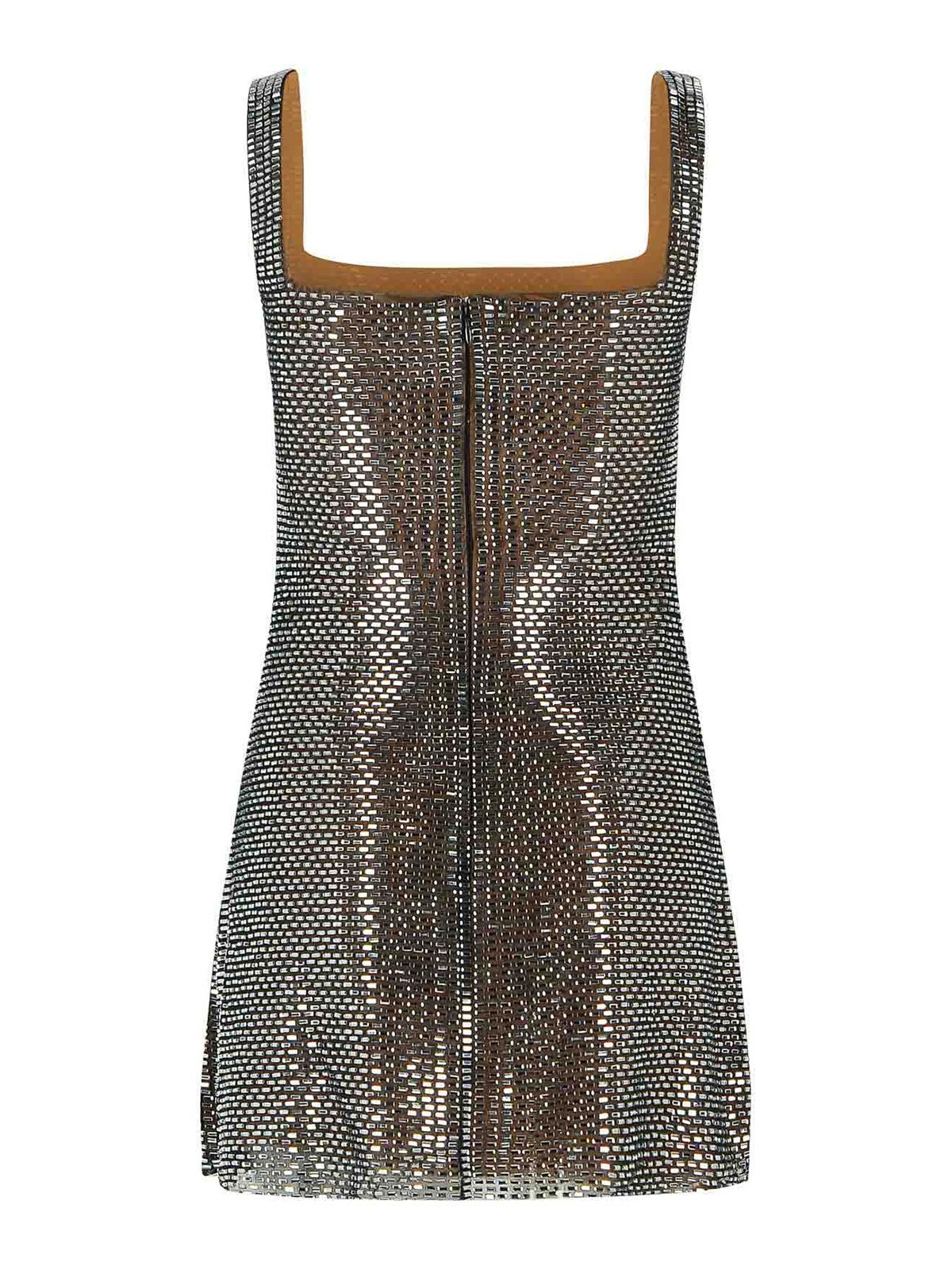 伸縮性のあるポリエステル製、全体に装飾が施されています。幅広のストラップ、隠しファスナー付きのバッククロージャー、裾にフロントスプリット