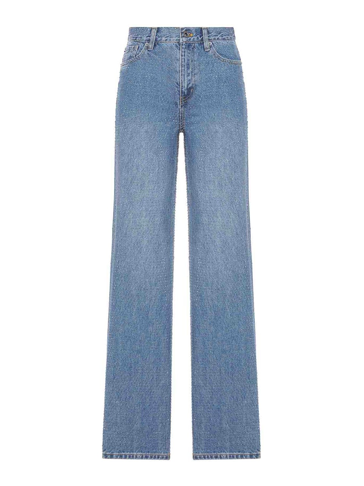 ラインストーン付きストレートレッグデニムジーンズ、ハイウエスト、ファスナーとボタン留め、ベルトループ、伸縮性が最小限に抑えられたこのスタイル、5ポケットスタイル、コントラストステッチ、100% コットン、色:ブルー