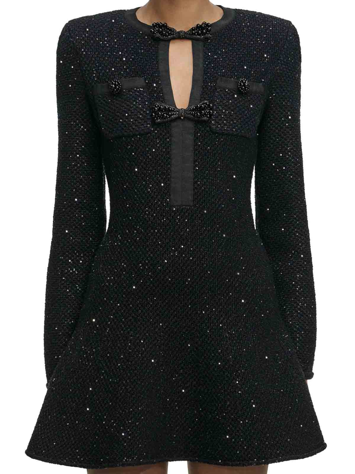 黒のスパンコールをあしらったニットのミニドレス、ストレッチ素材、フロント開口部のクルーネック、フロントにジュエリーアップリケ付きスナップボタン留め、ジュエリー付きアップリケ付きフロントポケット2つ、取り外し可能な内側のショルダーストラップ、伸縮性のある袖口、モデルの身長178cm、Sサイズ、色:黒