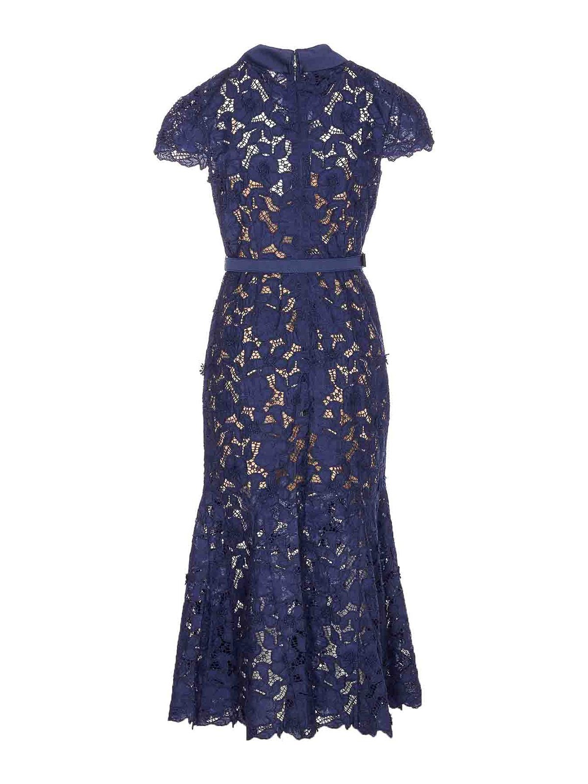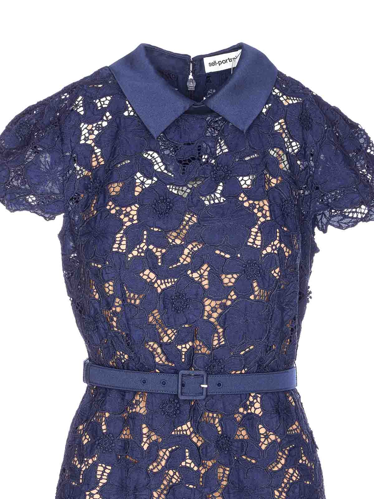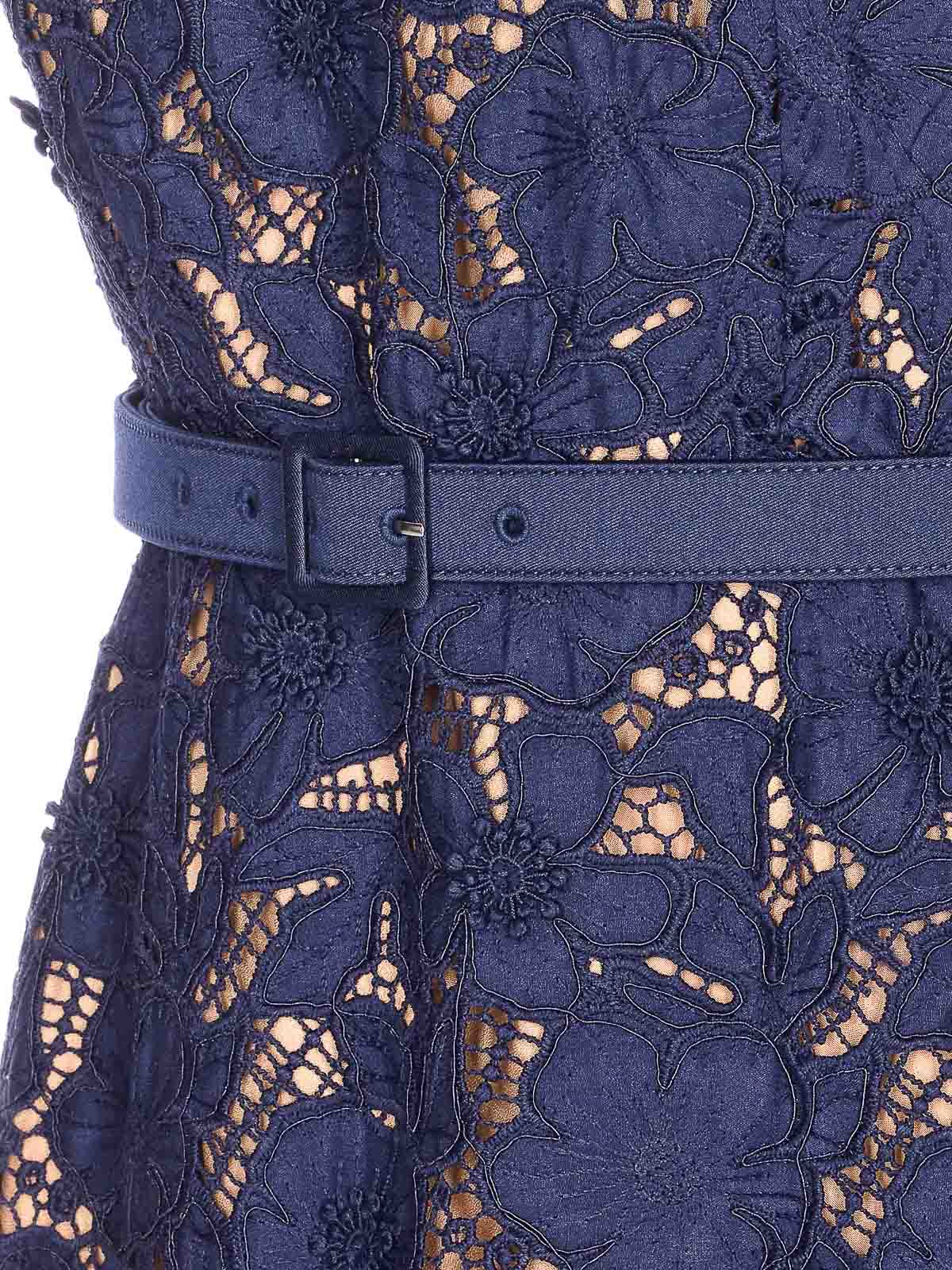 セルフポートレートブルーギピュールレースドレス、背面にファスナーとフック留め、レギュラーカラー、ペチコート、ウエストにベルト、ノースリーブ、ミディモデル、ベルトディテール
