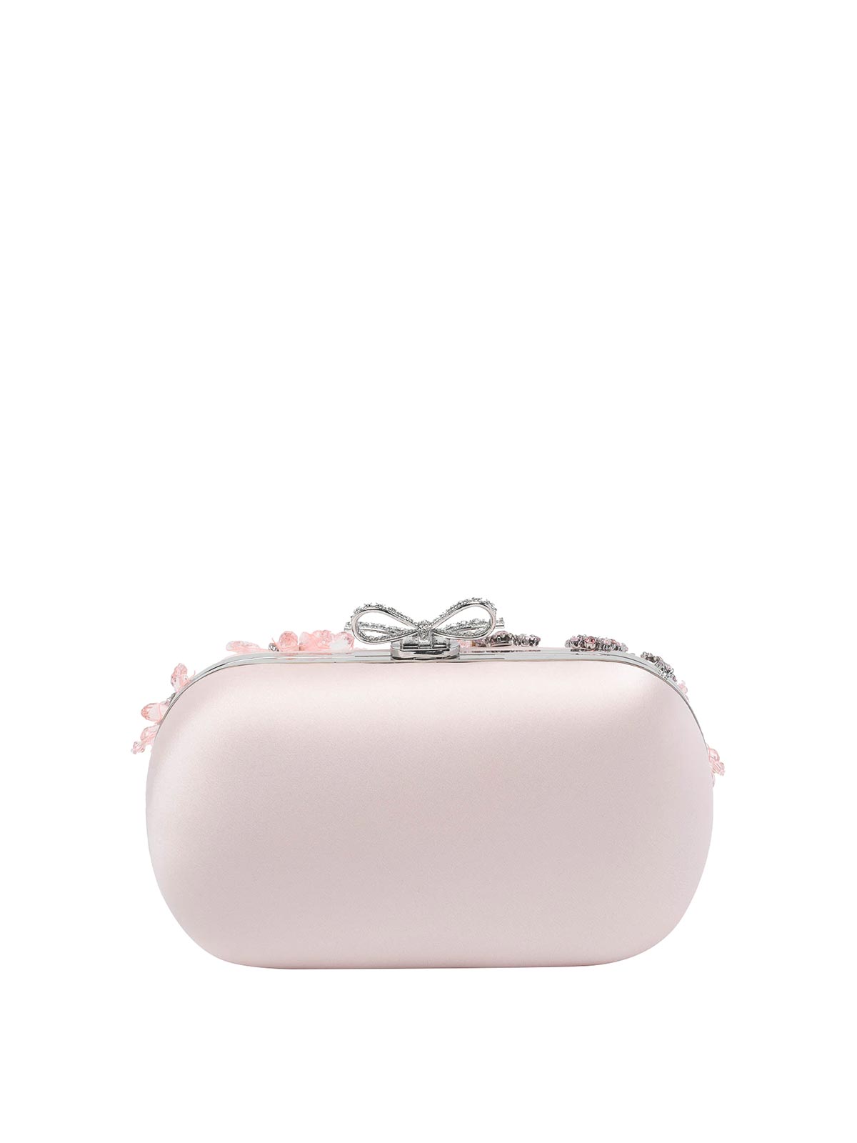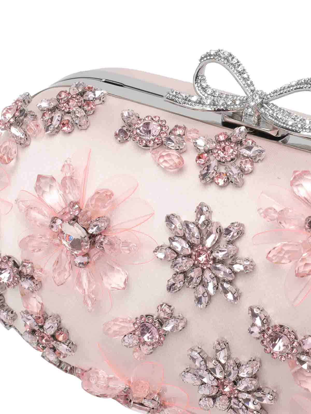セルフポートレートピンクフローラルクリスタルクラッチ、インターロッキングクロージャー、インナーオープンポケット、取り外し可能なチェーンストラップ