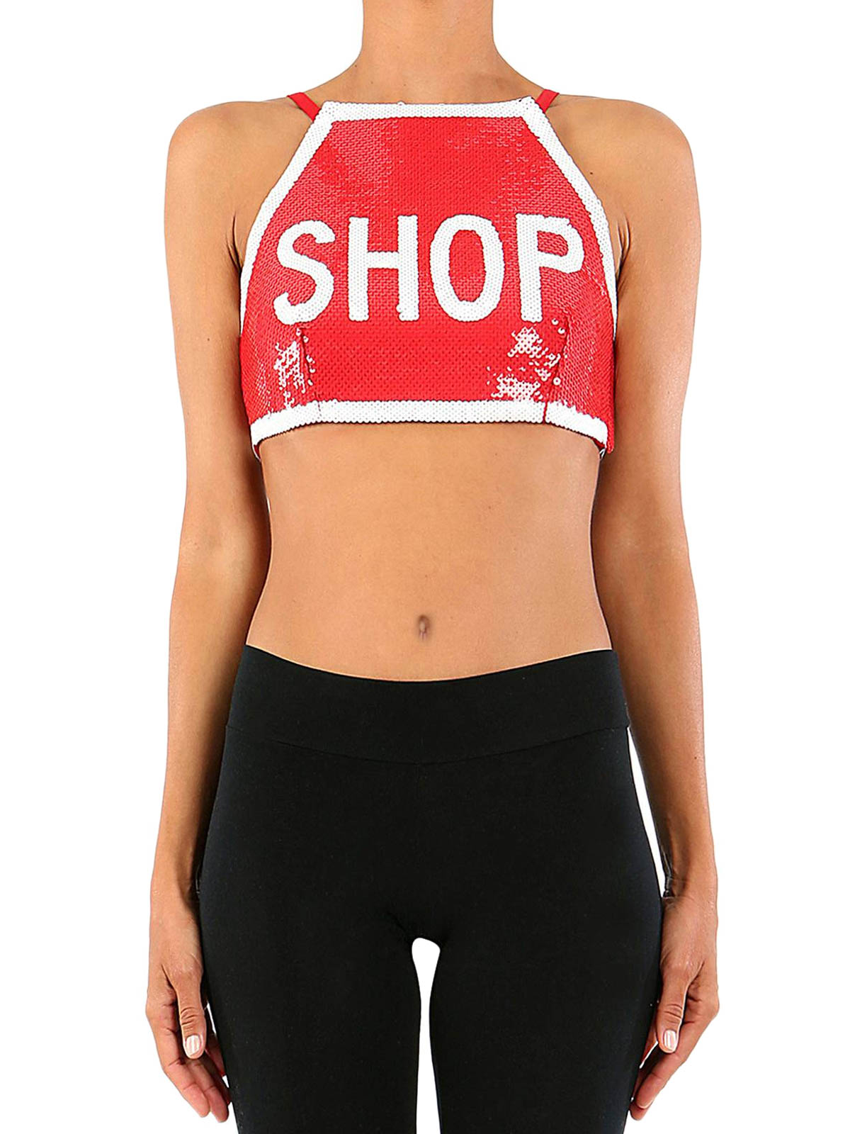 Sequinned crop top with a road signal inspired design and a contrasting Shop slogan.