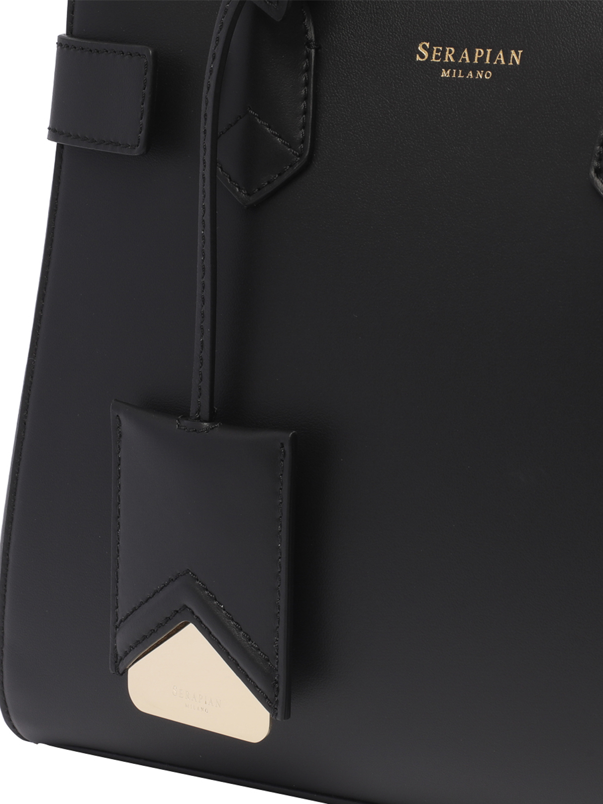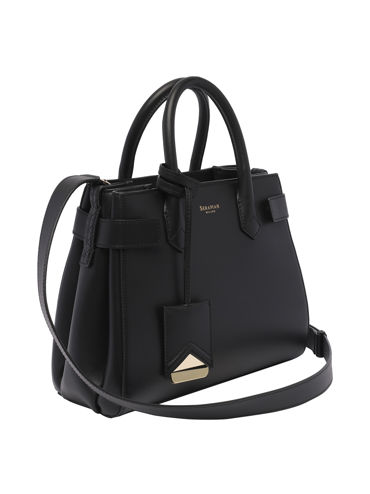 Serapian ブラックニューメリンのハンドバッグセクション、内側にファスナー付きポケット、オープンポケットハンドル、調節可能で取り外し可能なストラップ、フロントにミニロゴ