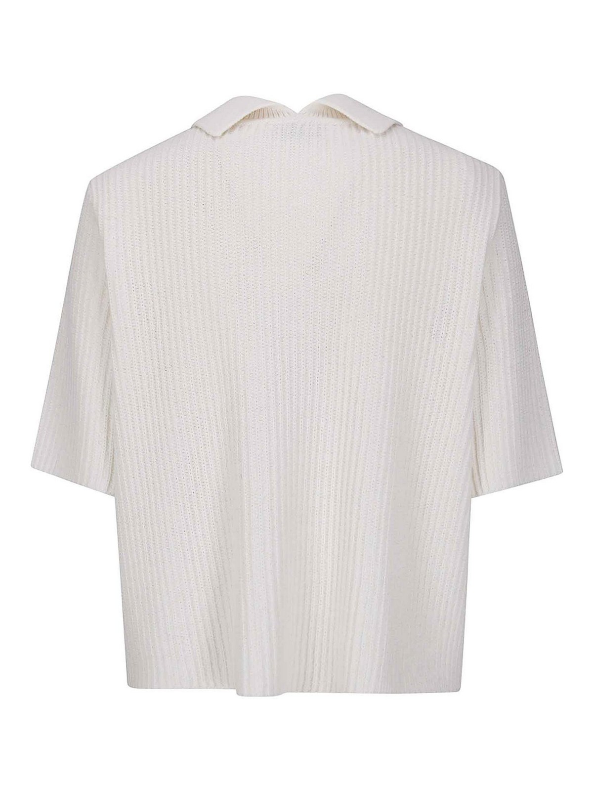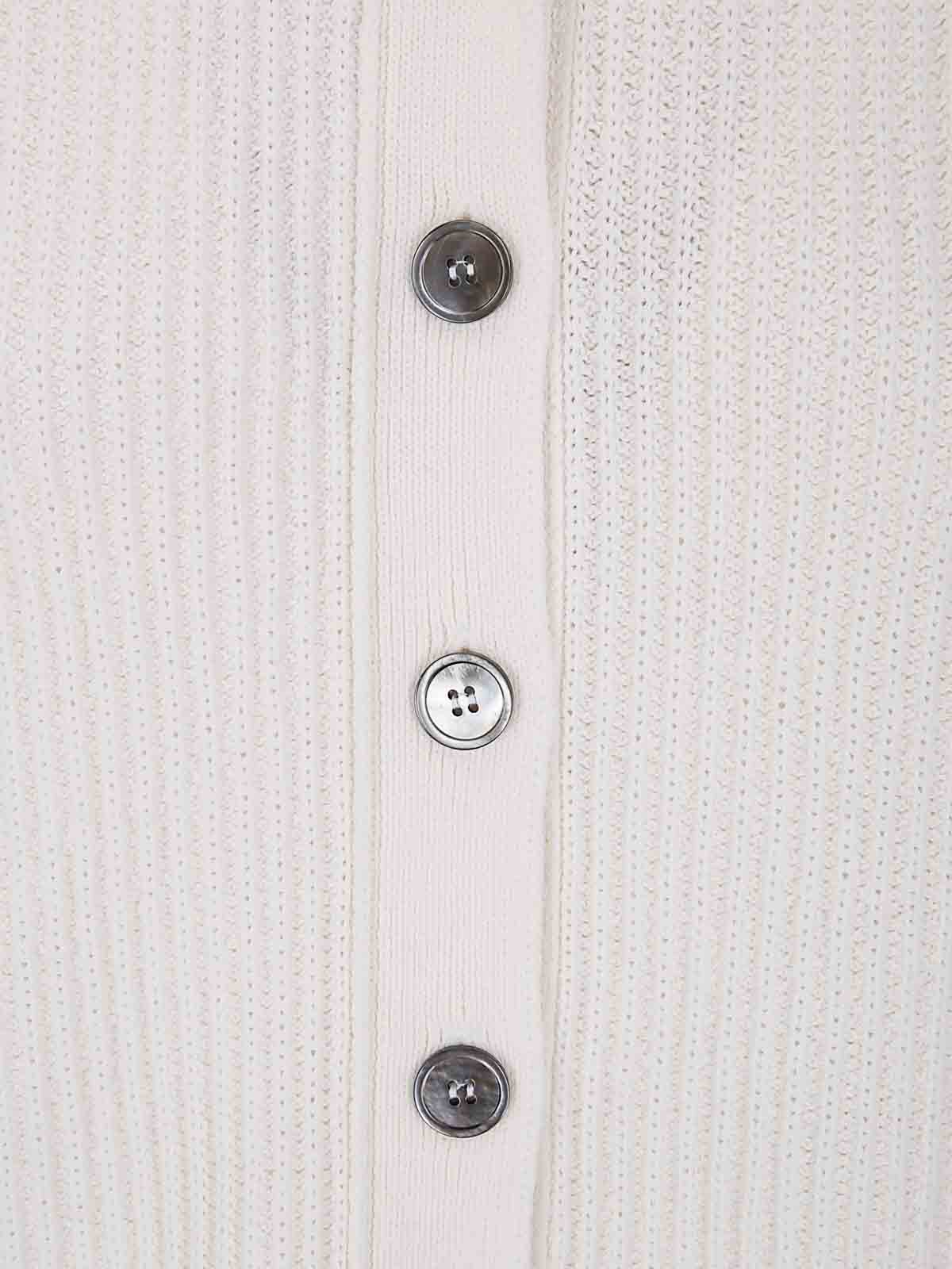 厚手の生地のポロセーター、マザーオブパール効果のフロントボタン、後ろのディテールが施された襟。