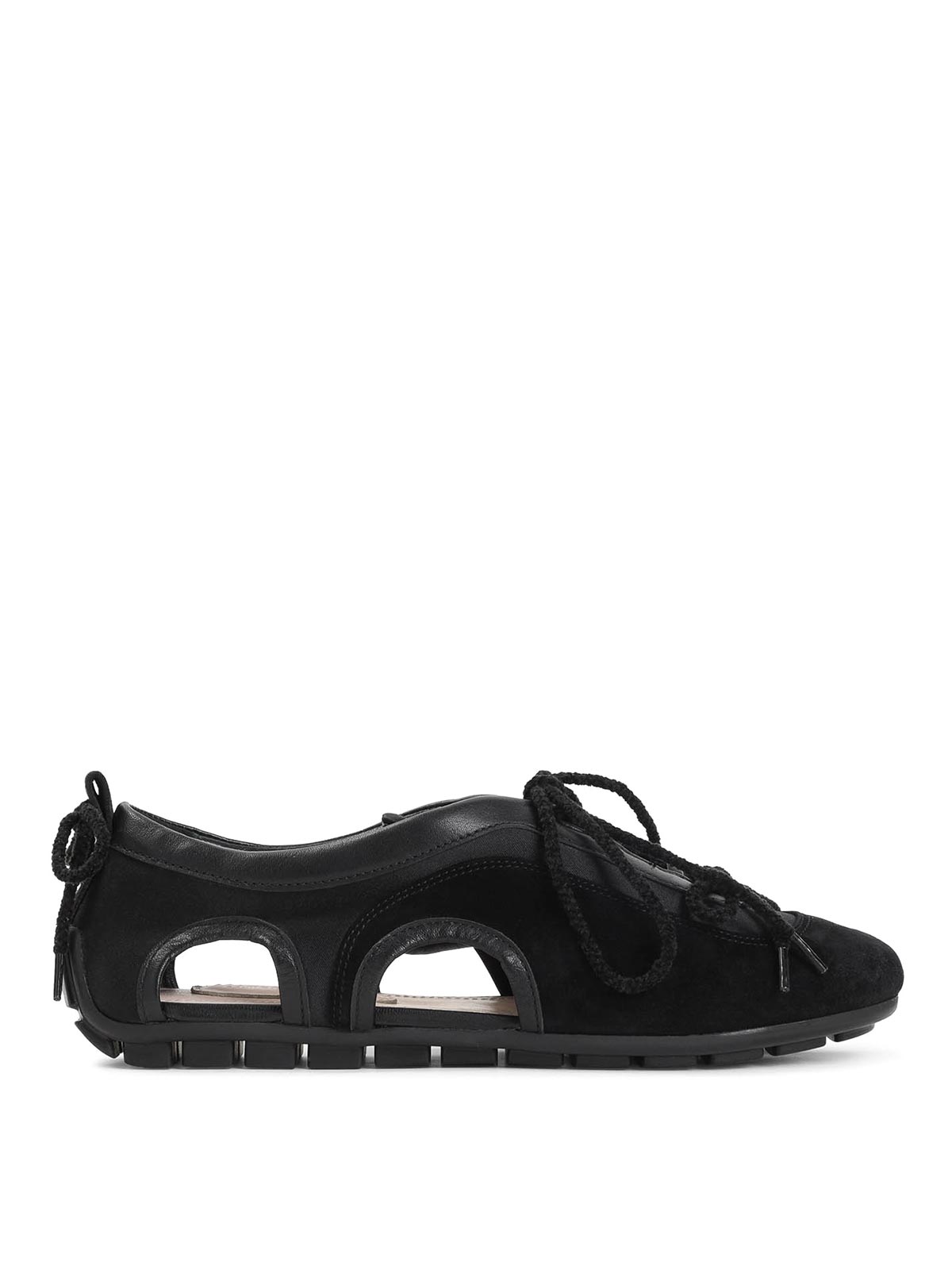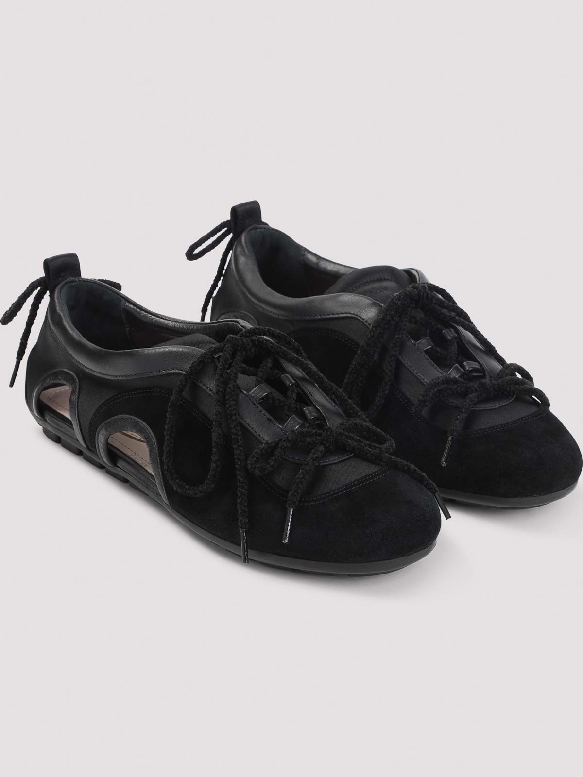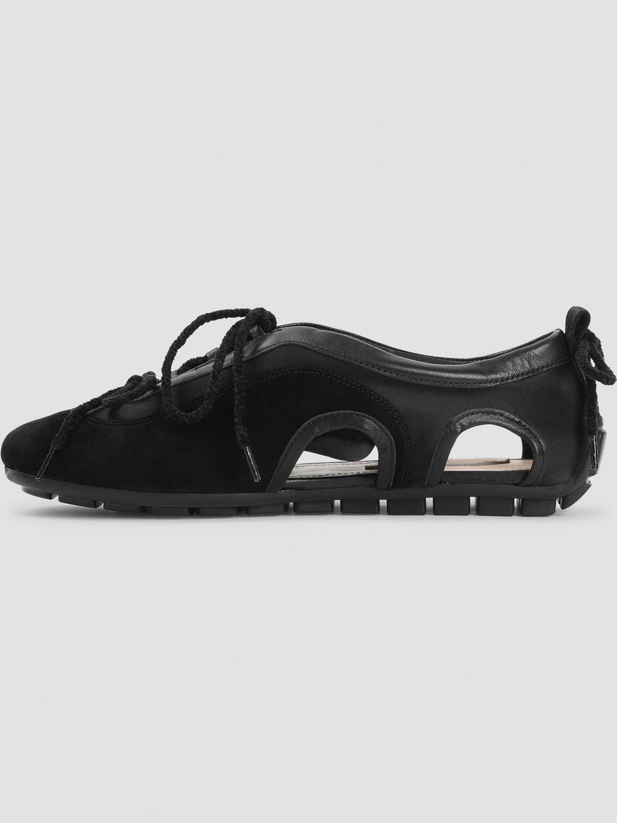 Simone rocha ブラックカットアウトバレリーナグリップトレインスニーカー。ポリウレタンとスエードレザー製。ラウンドトウ、トップトーナルレースアップファスナー、サイドカットアウトディテール、バックトーナルレースアップファスナー、トーナルラバーソール。