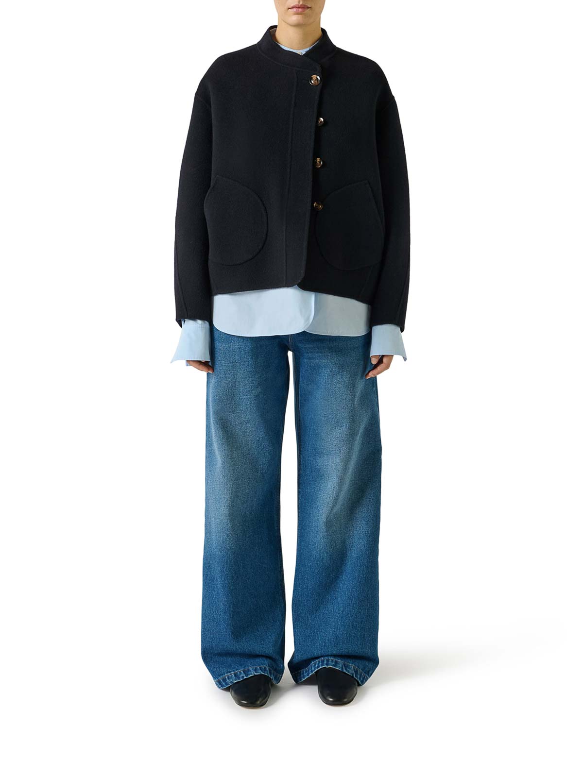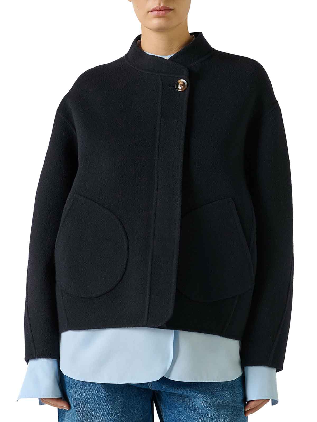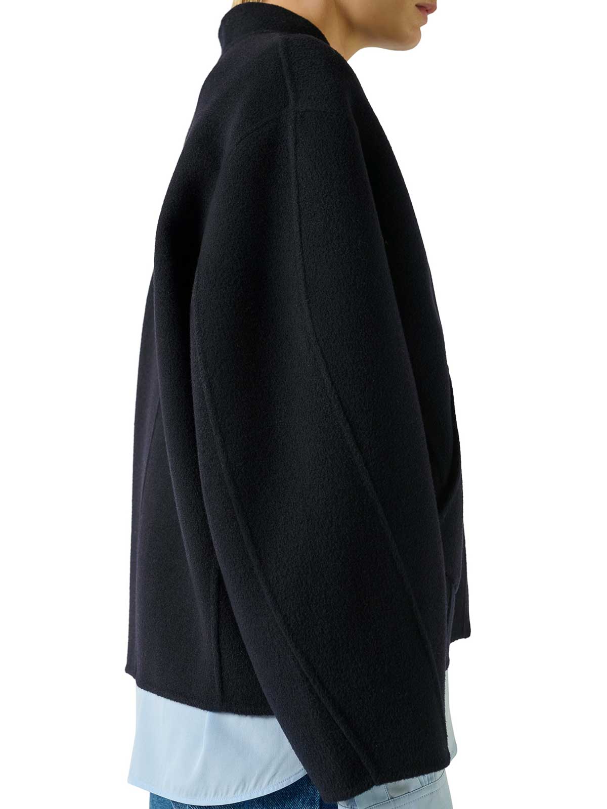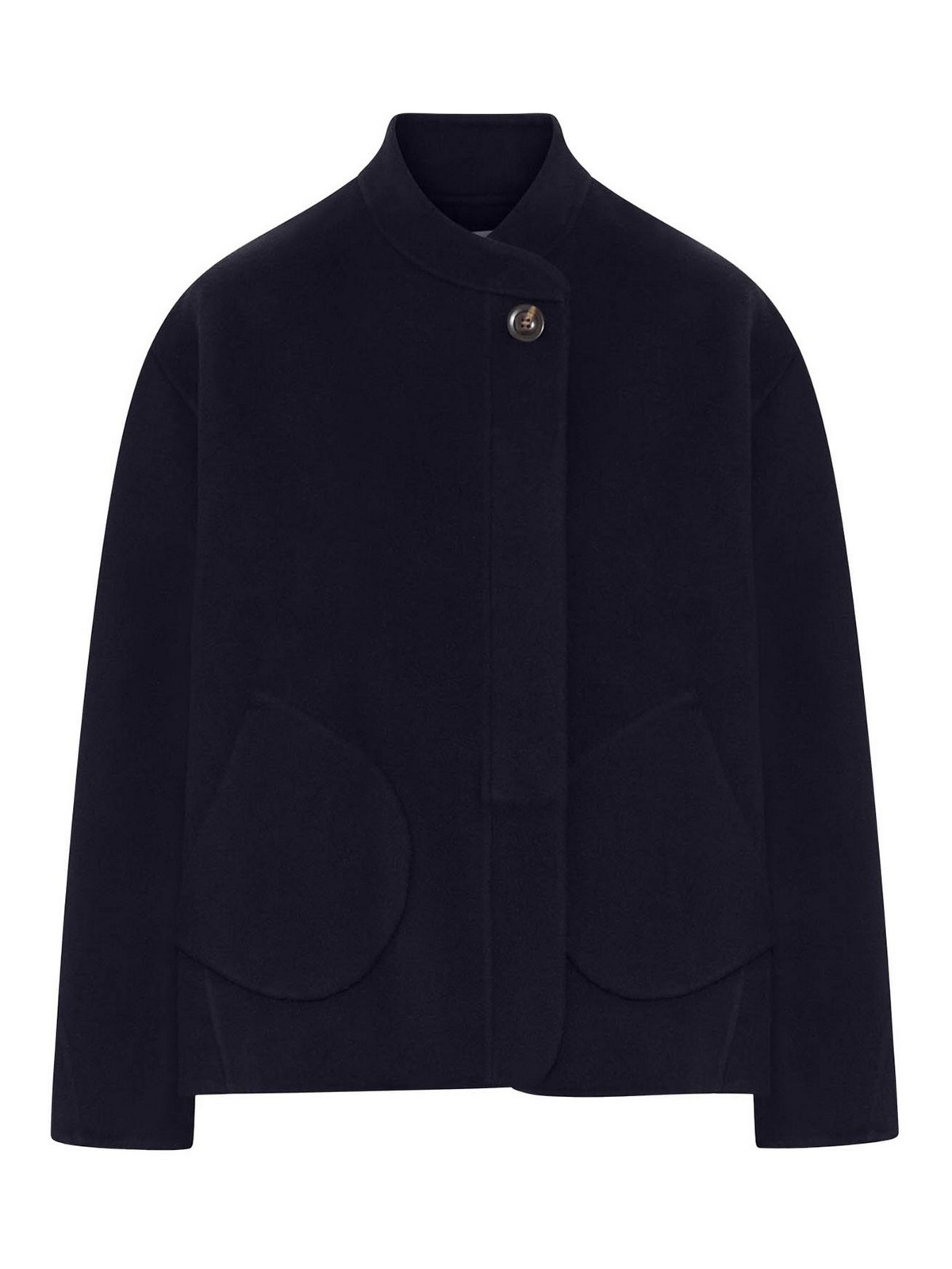 ショートルーズ、フィットコート、ロングラウンドスリーブ、アシンメトリースタンド、アップカラー、ラップ、セミオープンオーバー、隠しボタン、パッチポケット、ダブルフェイス、ネイビー