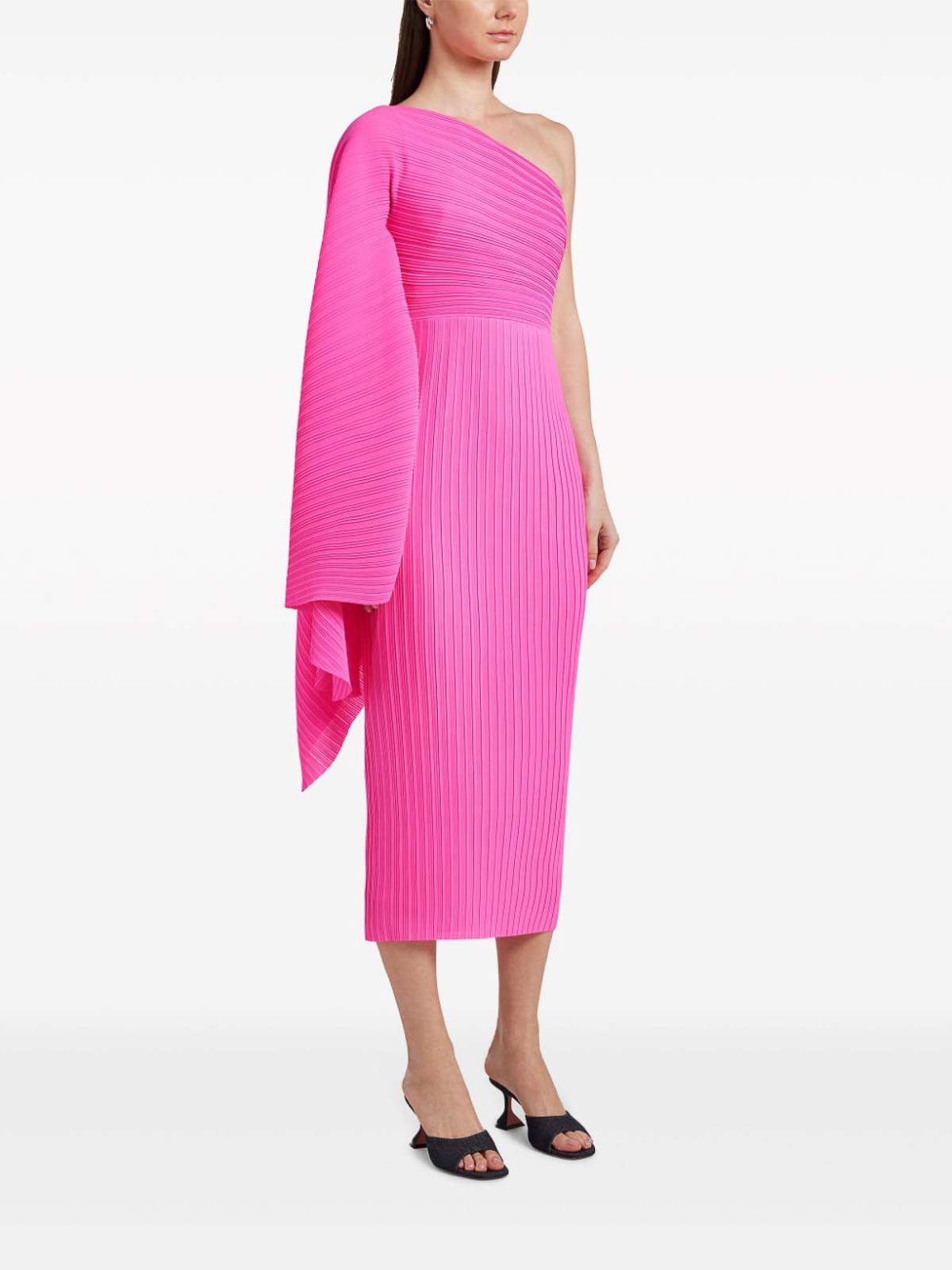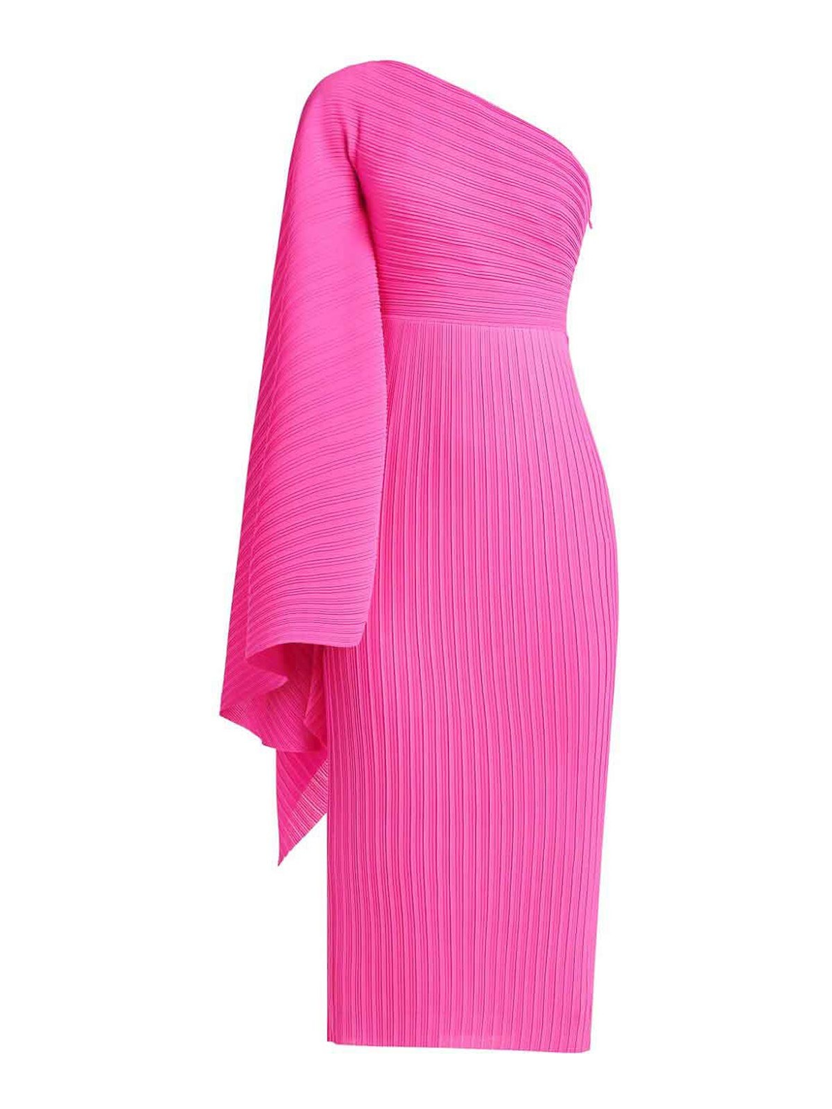 フューシャピンクのリブニットワンショルダーシングルロングスリーブカーフレングスストレートヘム