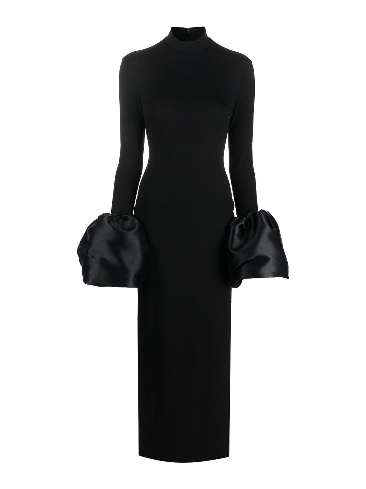 ブラックストレッチデザイン、ダッチェス織りモックネック、リアファスナー、ロングスリーブ、フレアカフス、アンクル、レングスストレートヘム