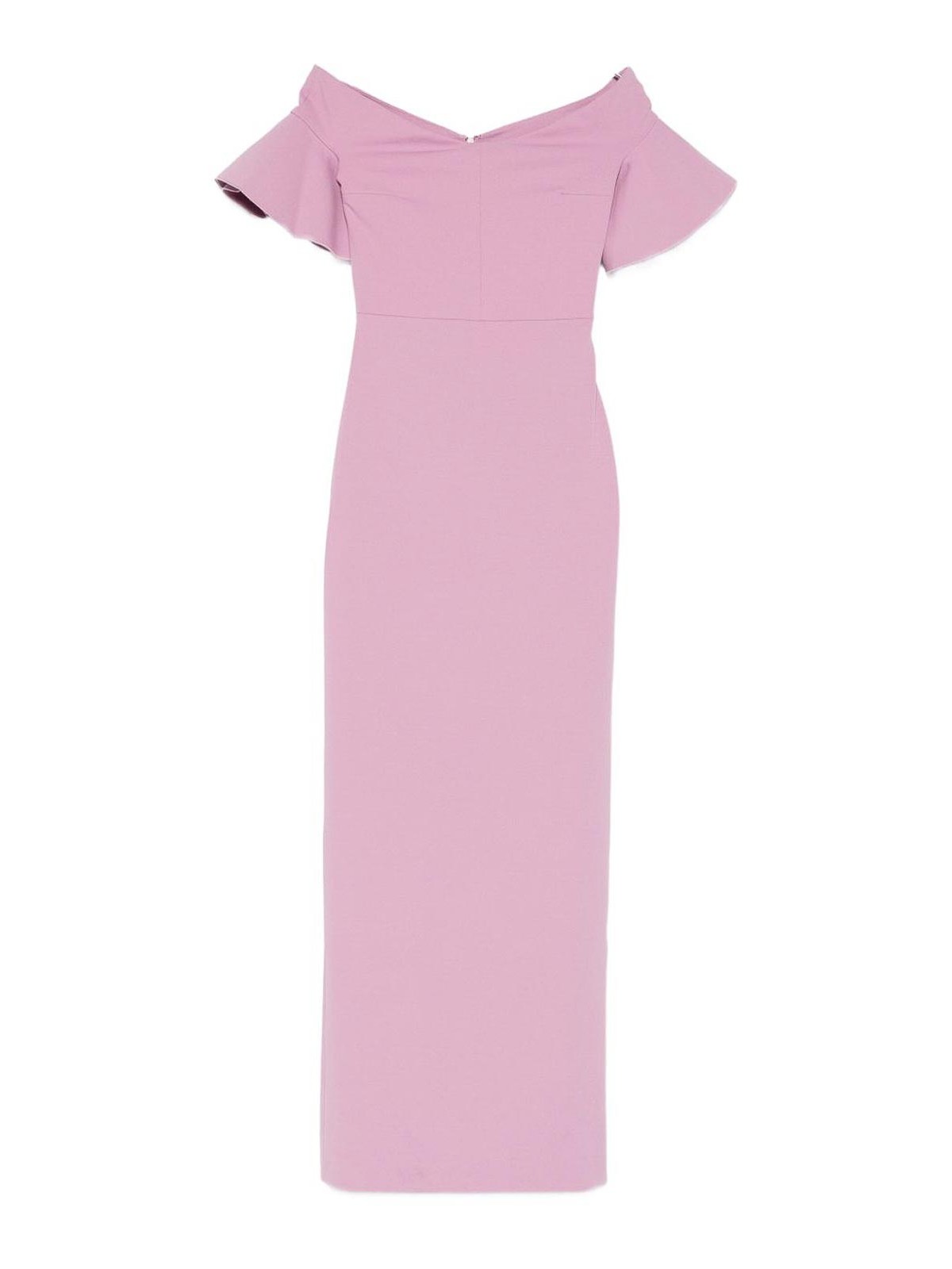 ブラッシュピンクのオフショルダーフリルスリーブコンシールジッパーリアスリット