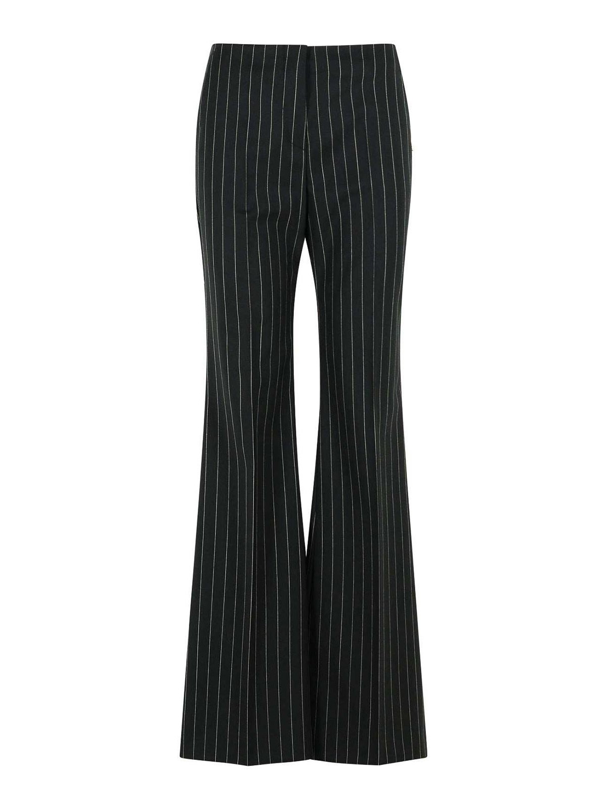 縦縞模様、隠しファスナー、ウエストにフックとボタン、サイドスリットポケット、後ろにウェルトポケット
