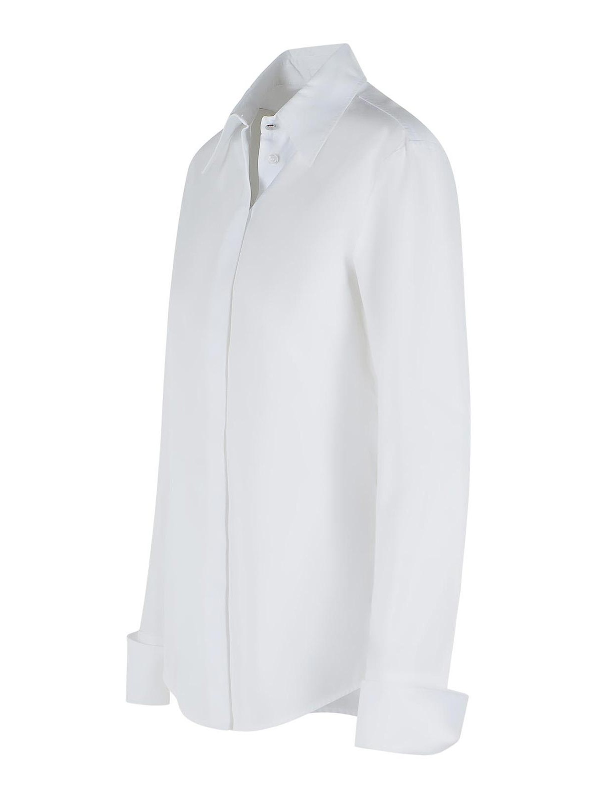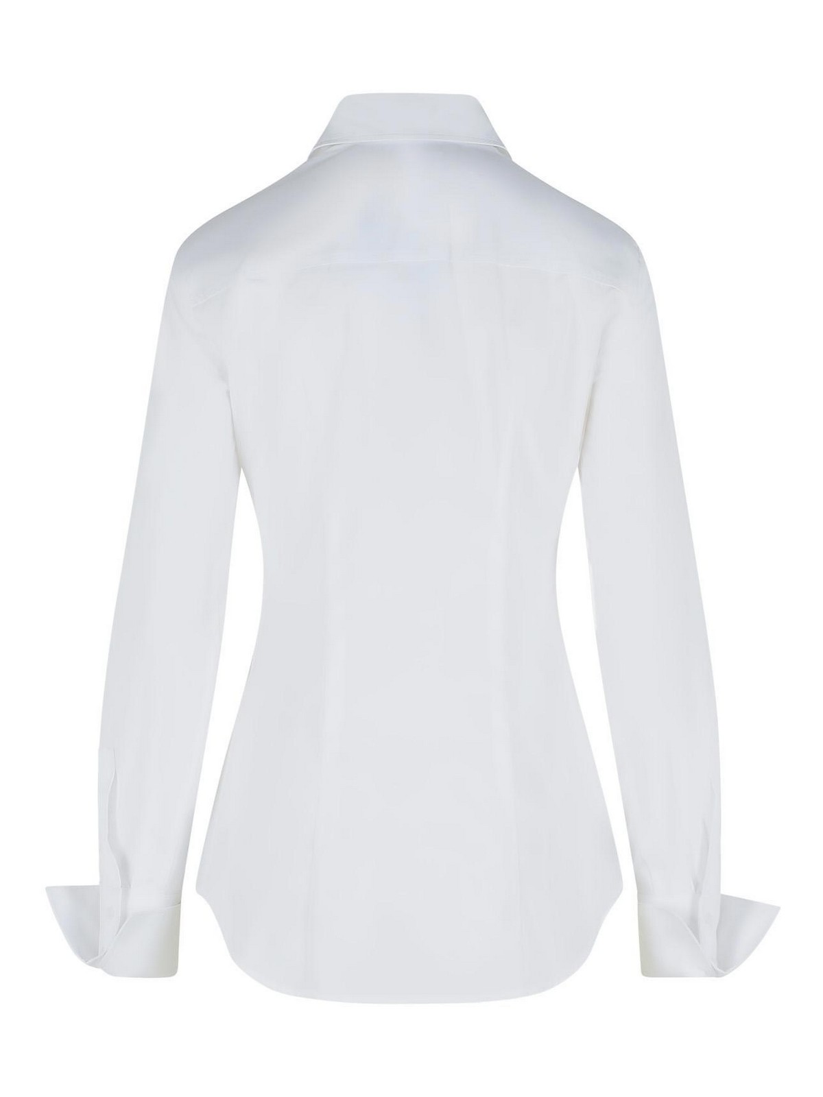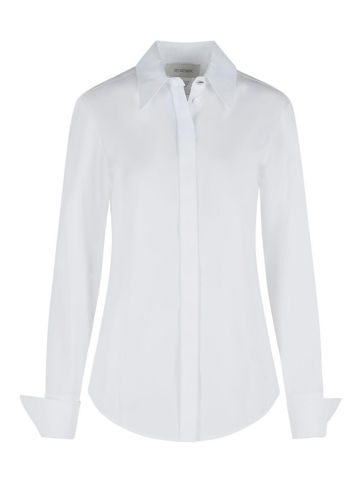 ポインテッドカラー、隠しボタン留め、シングルボタンカフス、ラウンドヘム、ウエストを引き締めるシルエット