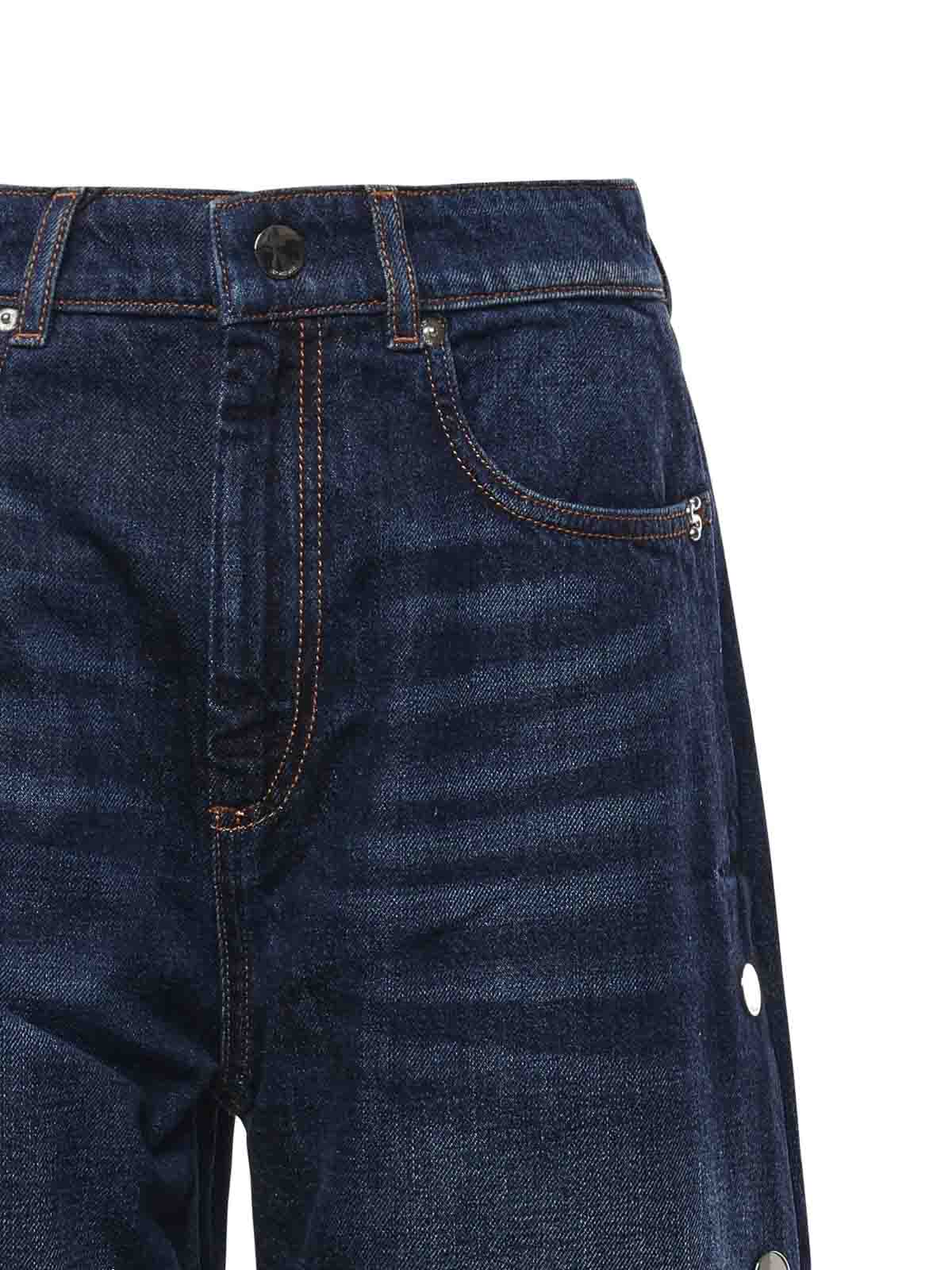 コットンデニム製、ベルトループ付きローライズ、サイドにスナップボタン、バックポケット、リラックスフィット、