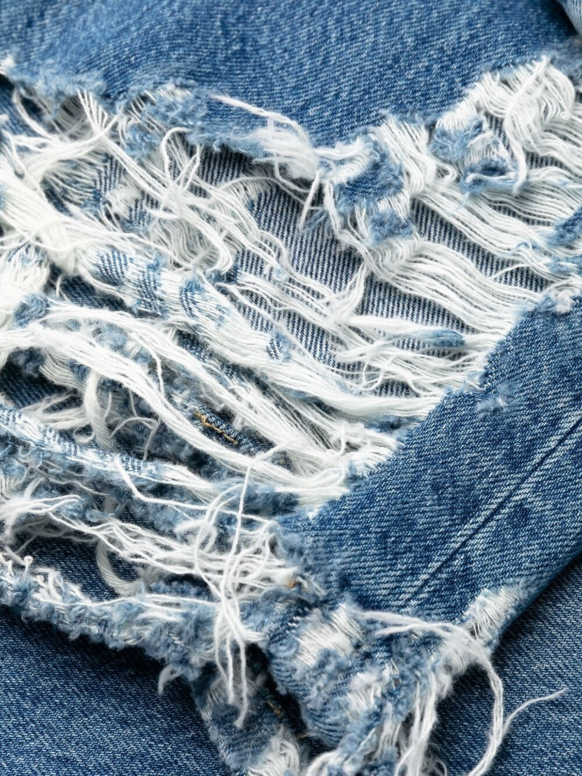 Stella McCartneyのインディゴブルーのアンティーク調加工ストレートレッグジーンズは、インディゴブルーのコットンダメージ加工が施され、太ももに色あせた効果のあるヒゲ効果が特徴です。フロントボタンで両サイドに斜めポケット2つ、後ろにパッチポケット2つ付き。サイズジーンズです。