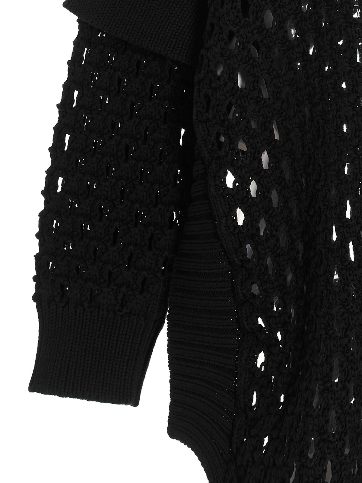 ビッグステッチの幅広オープンワークコットン混紡セーター。Vネックの固定ドローストリングとサイドにカットアウトのディテールが施されています。
