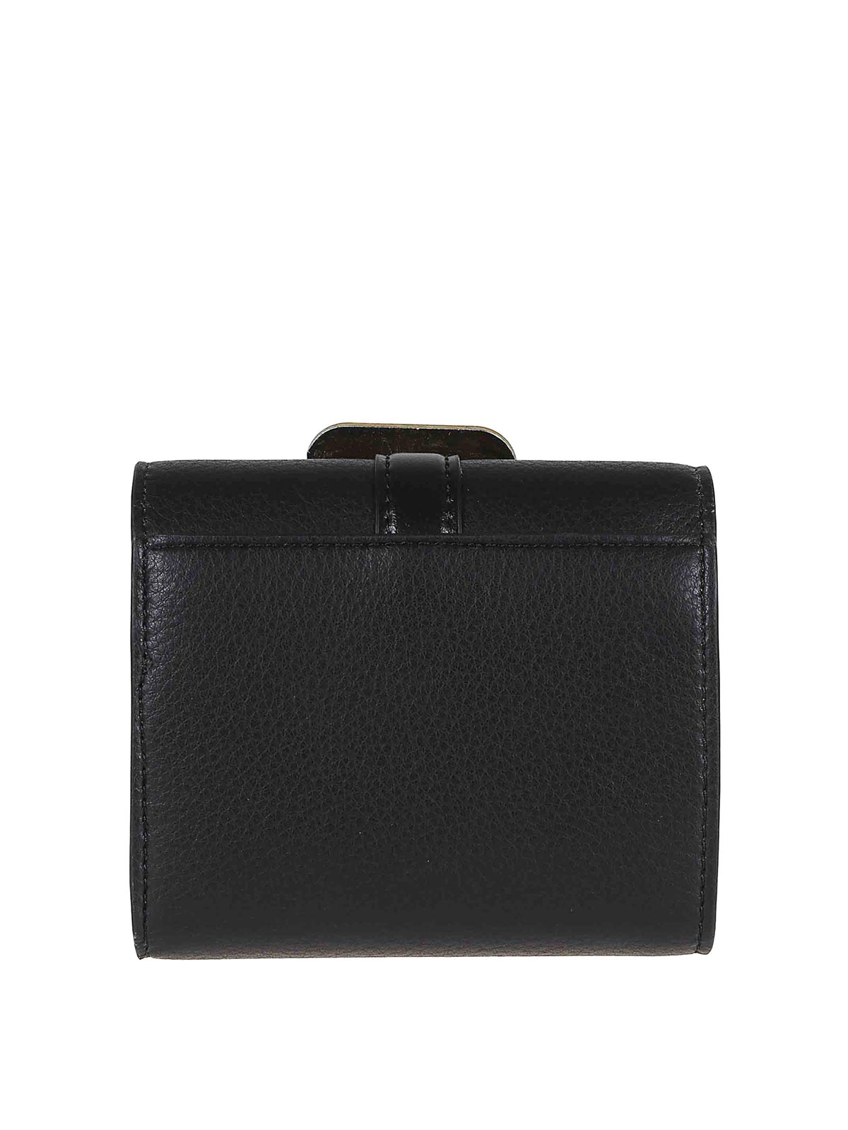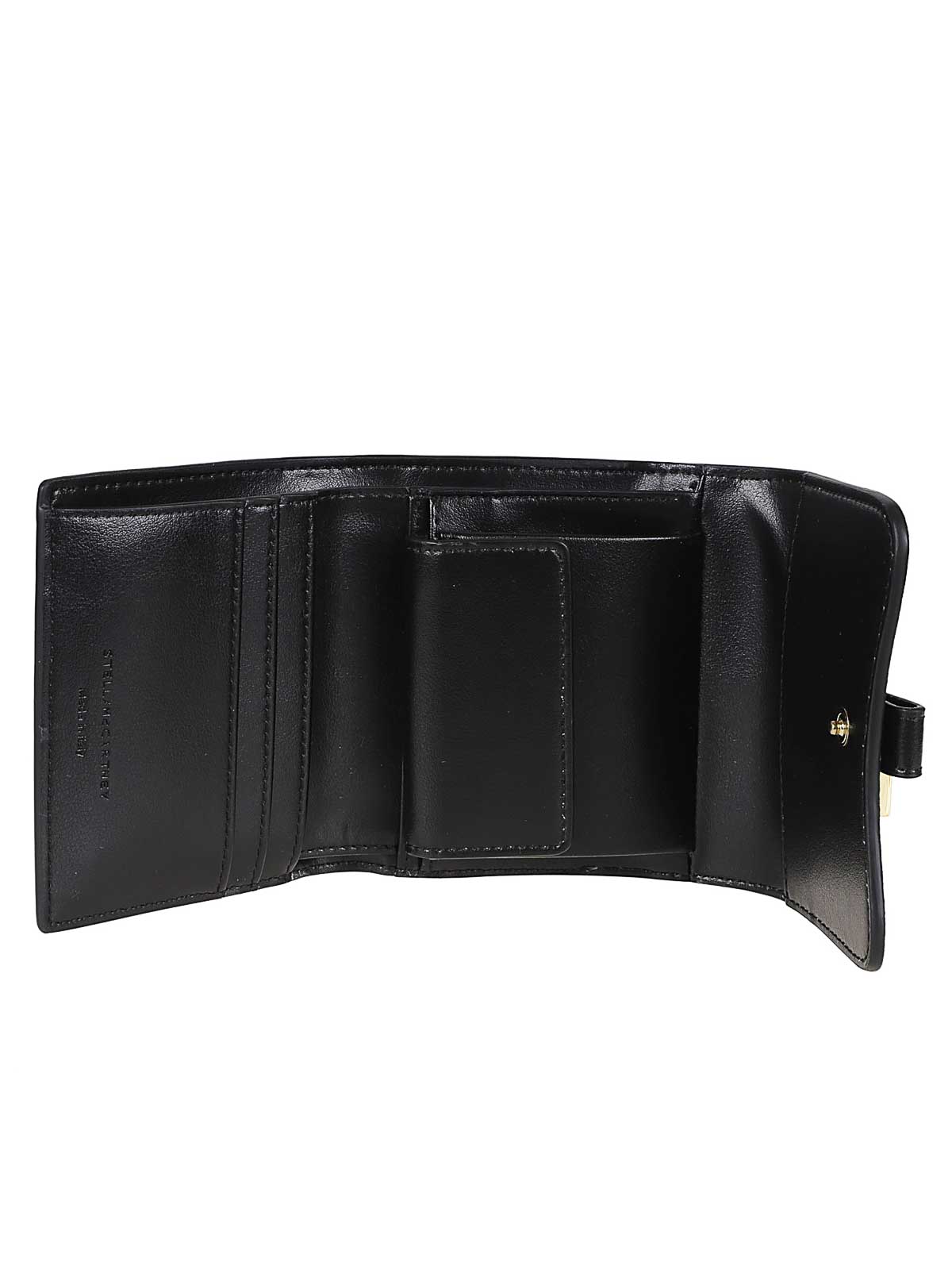 Stella McCartney ビーガン三つ折り財布。前面に真鍮の留め具があり、紙幣、硬貨、最大6枚のクレジットカードを収納できます。アイコニックな真鍮の南京錠チャームとライダーにインスパイアされた湾曲したフラップが特徴です。