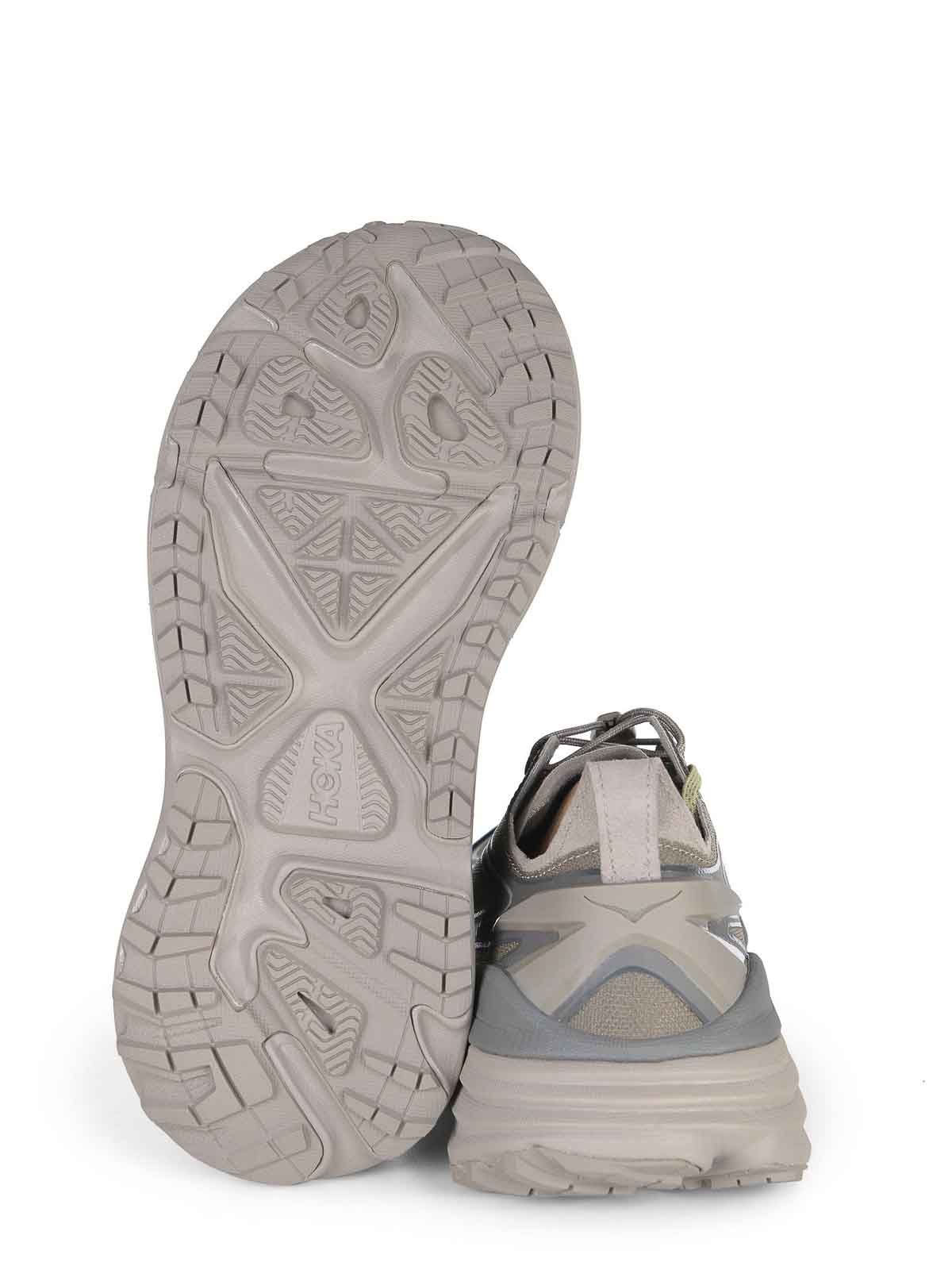 トープカラーの生地で作られた Hoka stinson one7 スニーカー、半透明モノメッシュのアッパー、マイクロファイバーカラー、ラウンドラバートゥ、レースアップ、ハイラバーソール、コントラストカラーのサイドロゴレタリング、100% ファブリック