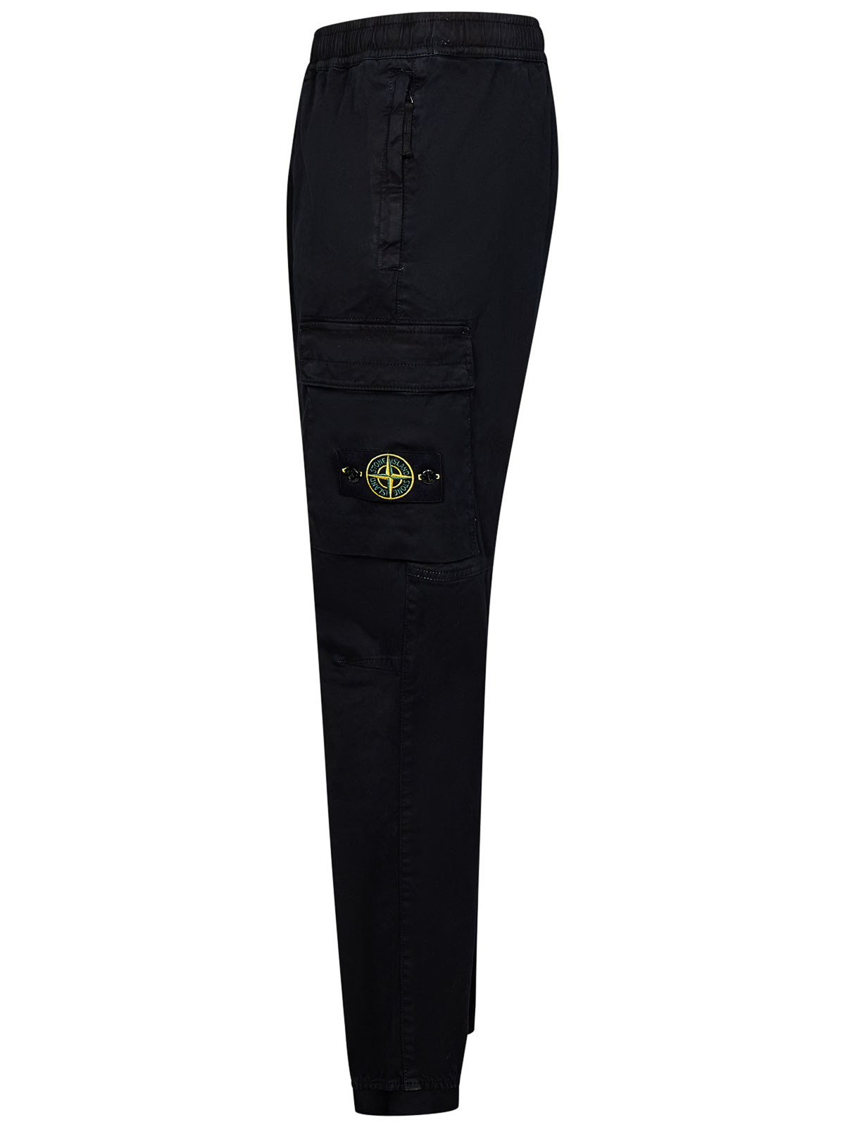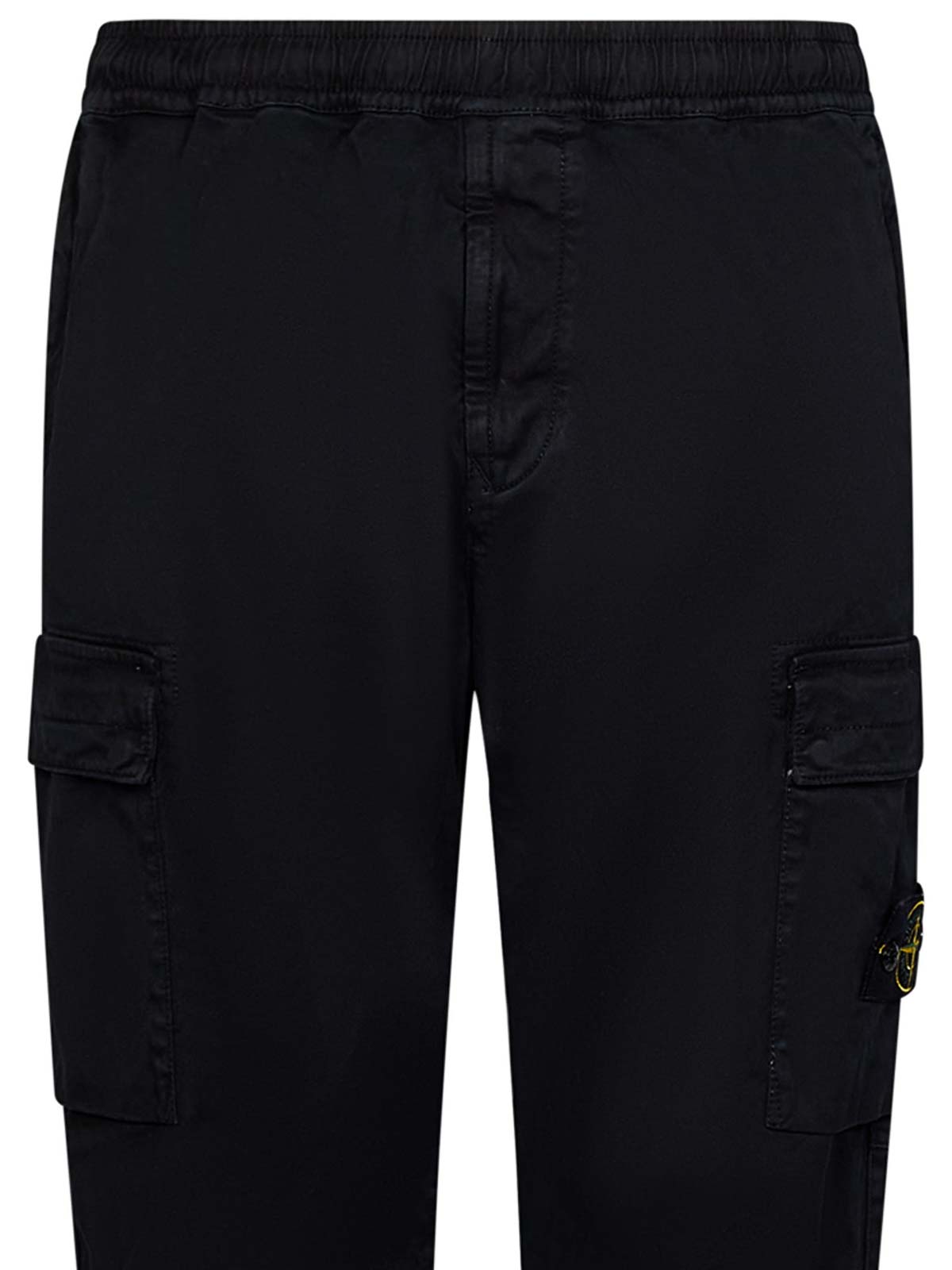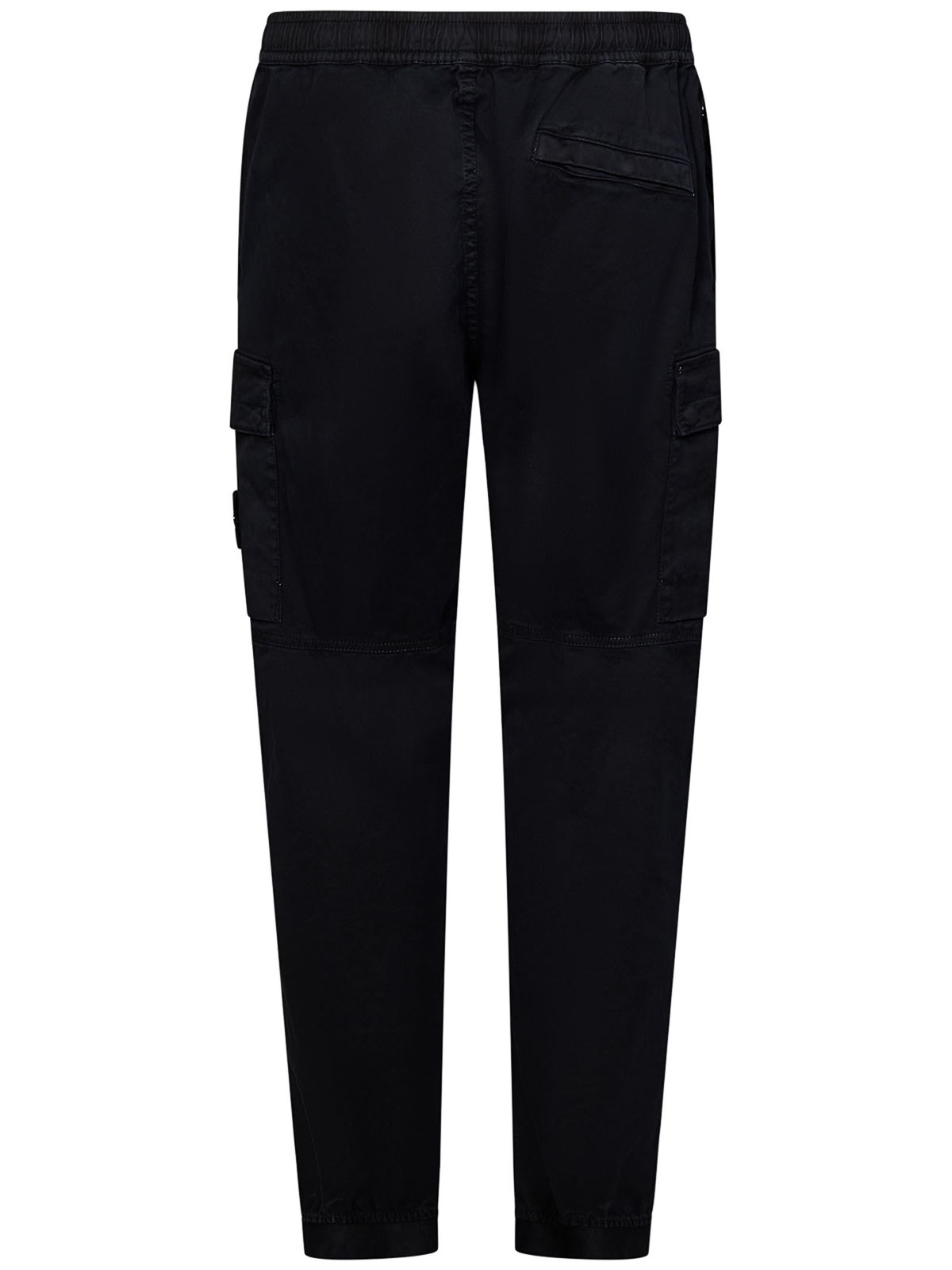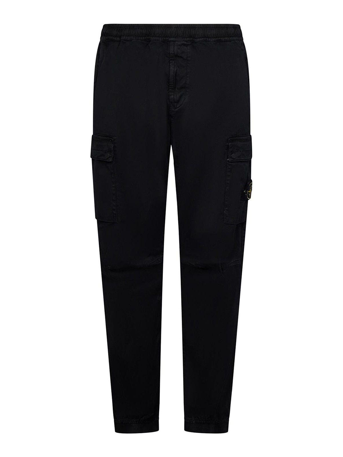 縫い目にドローストリングのハンドポケットが付いた伸縮性のあるウエストバンド。後ろに隠しスナップ付きの斜めのスリットポケット1つ。フラップベルクロとスナップ留め具が付いた各脚にベローズパッチポケット1つ。左のポケットには、足底にストーンアイランドのバッジの形をした膝用ゴムバンドが付いており、古い効果で染められた衣服は、写真のレギュラーテーパードフィットブラックに対応しています。