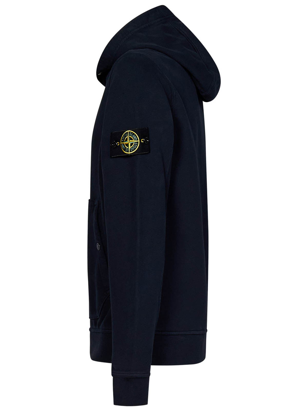 2つのスナップ留め具が付いたフード、長袖、左側にストーンアイランドのバッジ、斜めの入り口、スナップ留め具付きの斜めの入り口、リブ編みの袖口、ボトムバンド、写真では青く染められた衣服はMに相当します。