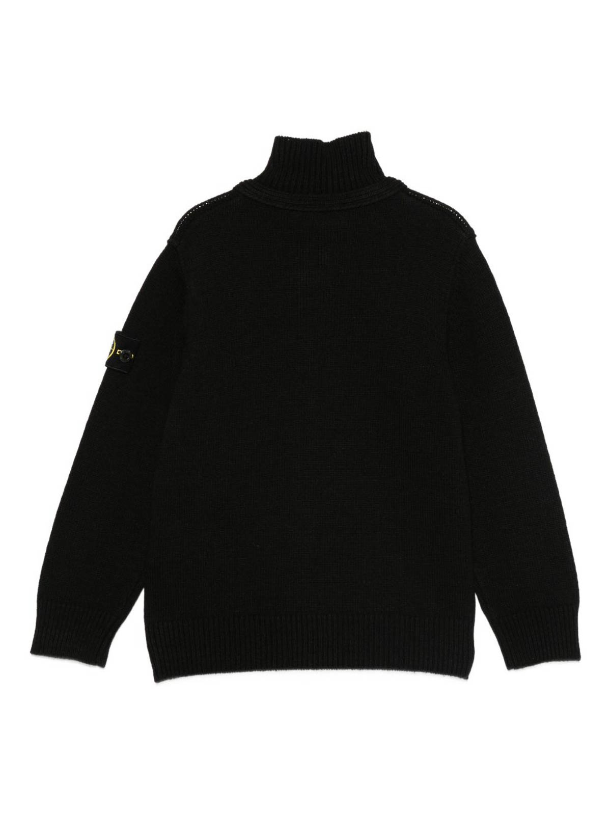 ボタン付きブラックリブニット、ハイカラー、ロングスリーブ、ロゴパッチが特徴