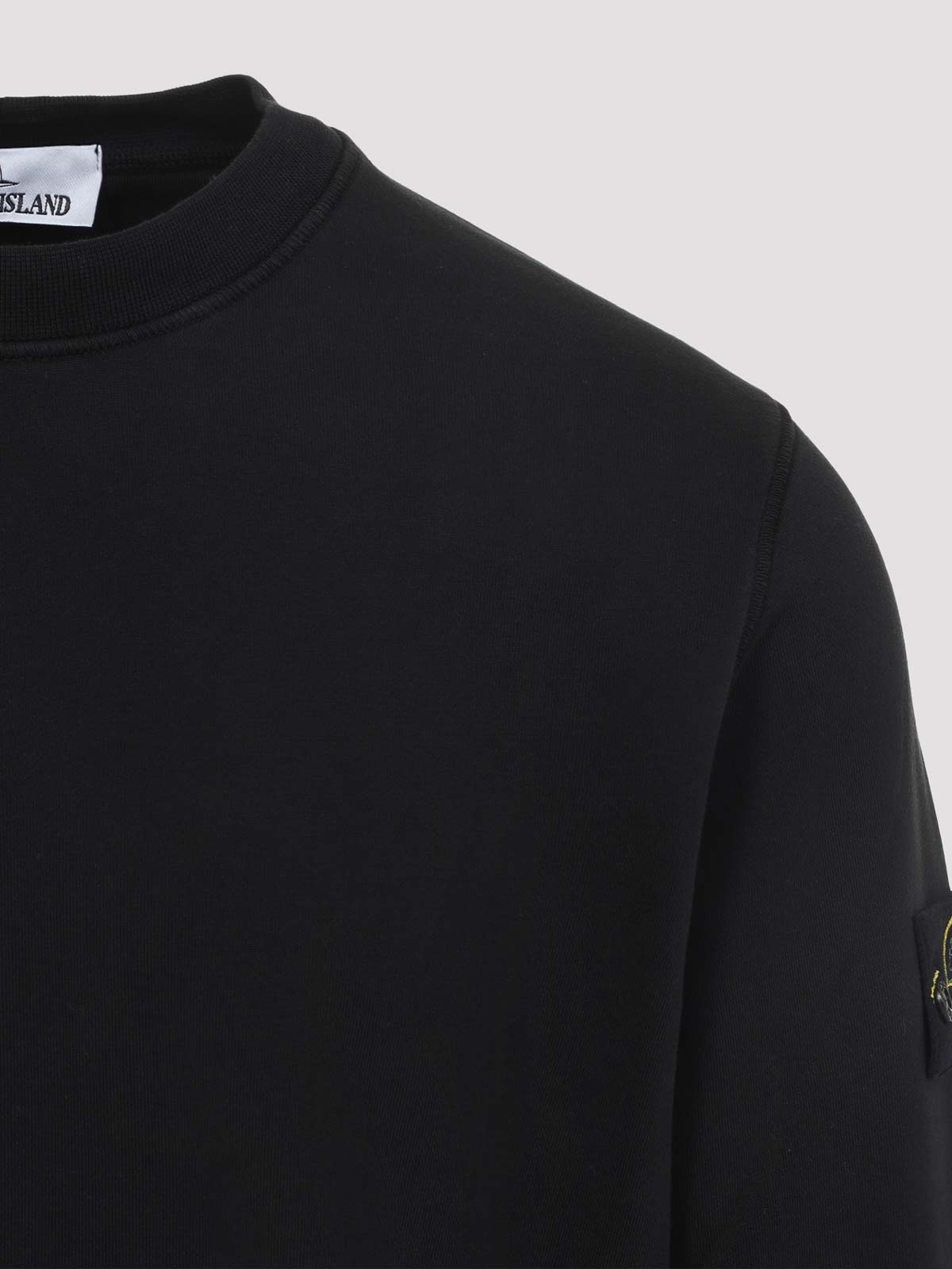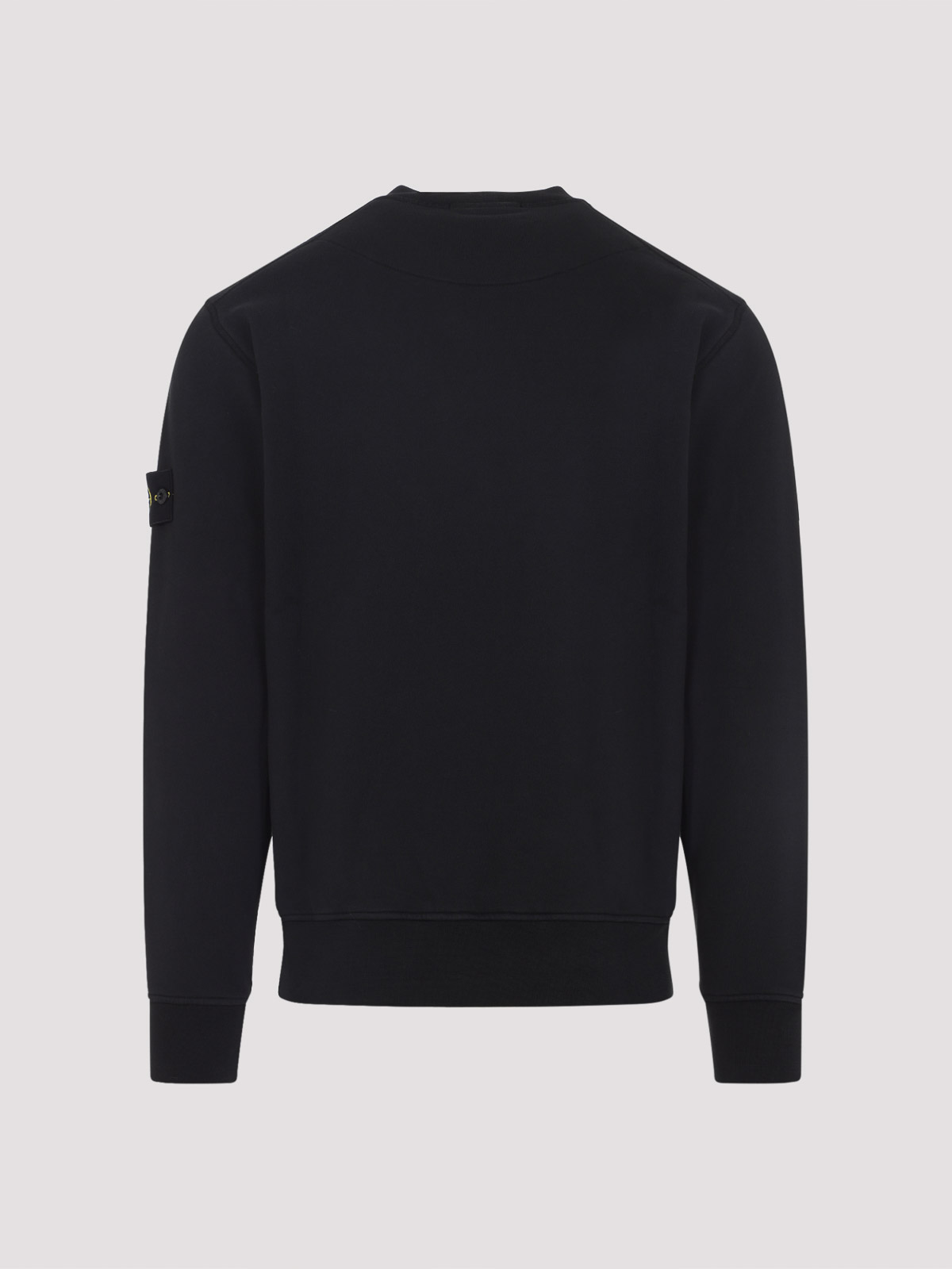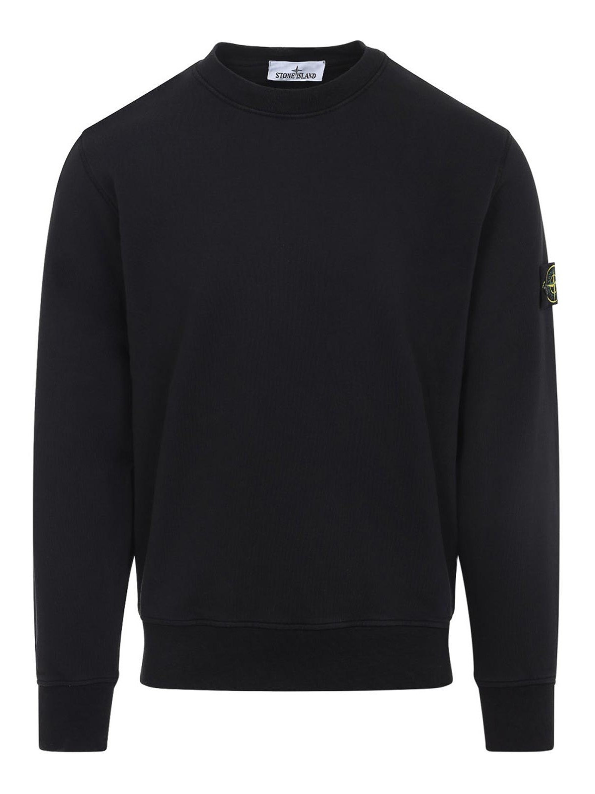 ストーンアイランドブラックコットンスウェットシャツ。ブラックコットンフリース、ラウンドネック、ロングスリーブ、袖にアイコニックなブランドラベル、細かいリブ編みのエッジ、ストレートヘム。