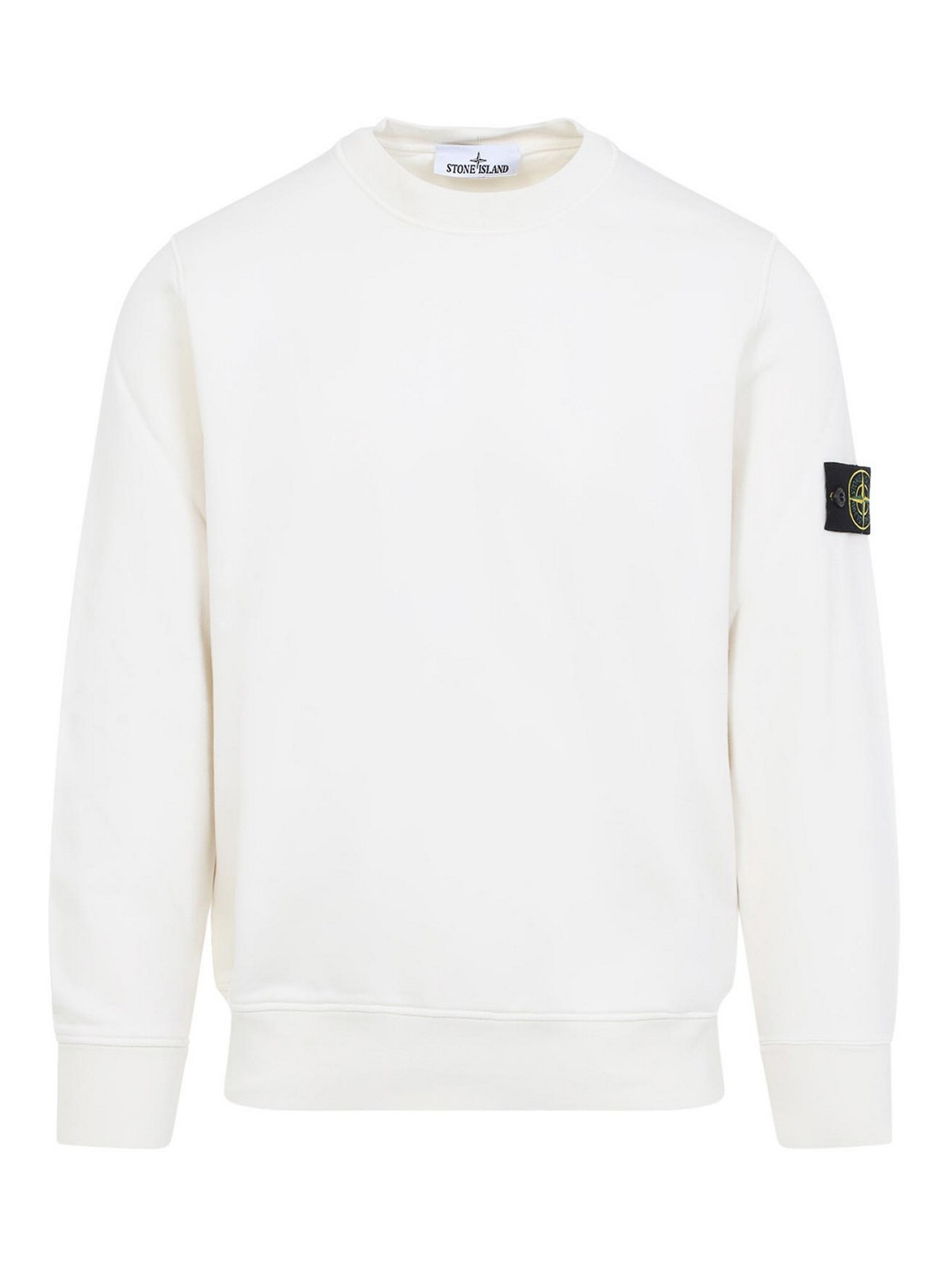 ストーンアイランドアイボリーコットンスウェットシャツ。アイボリーコットンフリース、ラウンドネック、ロングスリーブ、袖にアイコニックなブランドラベル、細かいリブ編みのエッジ、ストレートヘム。
